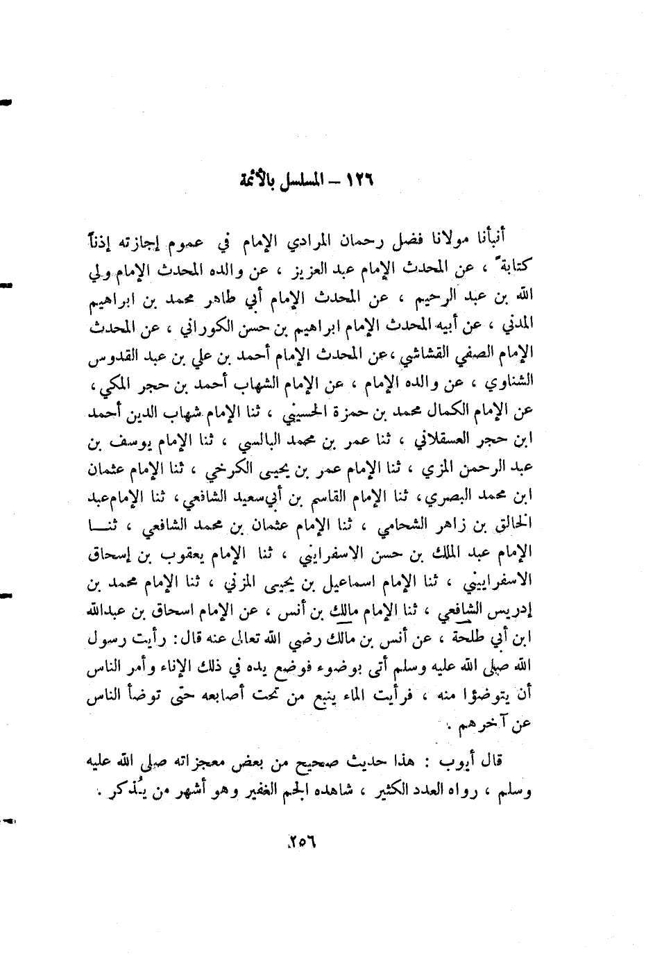 أنبأنا مولانا فضل رحمان المرادي الإمام في عموم إجازته إذناً كتابةً، عن المحدث الإمام عبد العزيز، عن والده المحدث الإمام ولي الله بن عبد الرحيم، عن المحدث الإمام أبي طاهر محمد بن إبراهيم المدني، عن أبيه المحدث الإمام إبراهيم بن حسن الكوراني، عن المحدث الإمام الصفي القشاشي، عن المحدث الإمام أحمد بن علي بن عبد القدوس الشناوي، عن والده الإمام، عن الإمام الشهاب أحمد بن حجر المكي، عن الإمام الكمال محمد بن حمزة الحسيني، ثنا الإمام شهاب الدين أحمد بن حجر العسقلاني، ثنا عمر بن محمد البالسي، ثنا الإمام يوسف بن عبد الرحمن المزي، ثنا الإمام عمر بن يحيى الكرخي، ثنا الإمام عثمان بن محمد البصري، ثنا الإمام القاسم بن أبي سعيد الشافعي، ثنا الإمام عبد الخالق بن زاهر الشحامي، ثنا الإمام عثمان بن محمد الشافعي، ثنا الإمام عبد الملك بن حسن الإسفرايني، ثنا الإمام يعقوب بن إسحاق الإسفراييني، ثنا الإمام إسماعيل بن يحيى المزني، ثنا الإمام محمد بن إدريس الشافعي، ثنا الإمام مالك بن أنس، عن الإمام إسحاق بن عبد الله ابن أبي طلحة، عن أنس بن مالك رضي الله تعالى عنه قال: رأيت رسول الله صلى الله عليه وسلم أتى بوضوء فوضع يده في ذلك الإناء وأمر الناس أن يتوضؤوا منه، فرأيت الماء ينبع من تحت أصابعه حتى توضأ الناس عن آخرهم.
