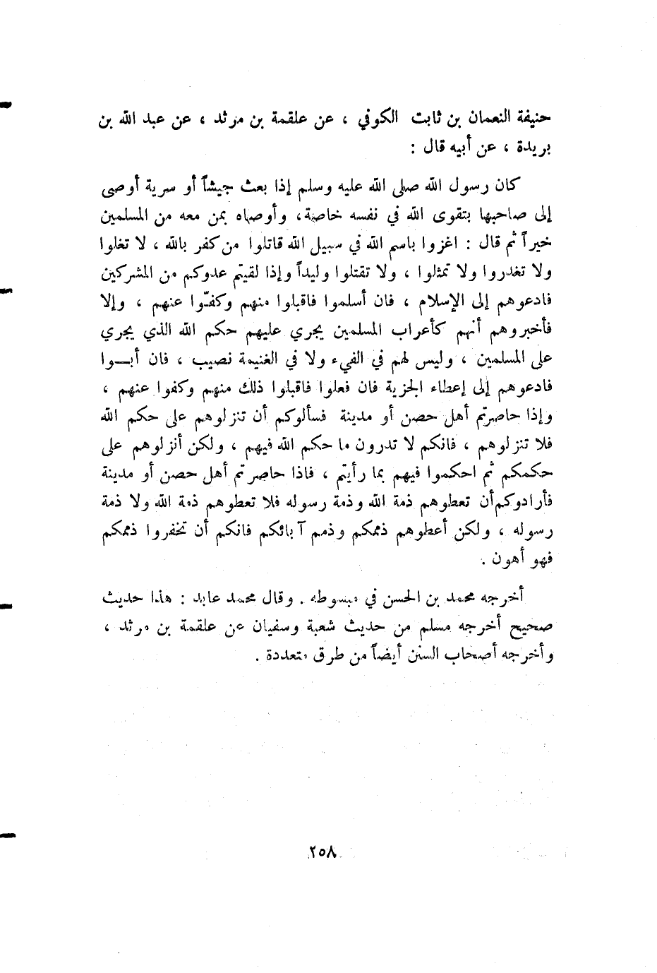 أخرجه محمد بن الحسن في مبسوطه. وقال محمد عابد: هذا حديث صحيح أخرجه مسلم من حديث شعبة وسفيان عن علقمة بن مرثد، وأخرجه أصحاب السنن أيضا من طرق متعددة.