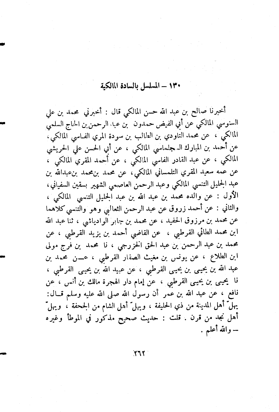 أخبرنا صالح بن عبد الله حسن المالكي قال: أخبرني محمد بن علي السنوسي المالكي عن أبي الفيض حمدون بن عبد الرحمن بن الحاج السلمي المالكي، عن محمد التاودي بن الطالب بن سودة المري الفاسي المالكي، عن أحمد بن المبارك السجلماسي المالكي، عن أبي الحسن علي الحريشي المالكي، عن عبد القادر الفاسي المالكي، عن أحمد المقري المالكي، عن عمه سعيد المقري التلمساني المالكي، عن محمد بن محمد بن عبد الله بن عبد الجليل التنسي المالكي وعبد الرحمن العاصمي الشهير بسقين السفياني، الأول: عن والده محمد بن عبد الله بن عبد الجليل التنسي المالكي، والثاني: عن أحمد زروق عن عبد الرحمن الثعالبي وهو والتنسي كلاهما عن محمد بن مرزوق الحفيد، عن محمد بن جابر الوادياشي، ثنا عبد الله بن محمد الطائي القرطبي، عن القاضي أحمد بن يزيد القرطبي، عن محمد بن عبد الرحمن بن عبد الحق الخزرجي، نا محمد بن فرج مولى ابن الطلاع، عن يونس بن مغيث الصفار القرطبي، عن محمد بن عبد الله بن يحيى بن يحيى القرطبي، عن عبيد الله بن يحيى القرطبي، نا يحيى بن يحيى القرطبي، عن إمام دار الهجرة مالك بن أنس، عن نافع، عن عبد الله بن عمر أن رسول الله صلى الله عليه وسلم قال: يهلّ أهل المدينة من ذي الحليفة، ويهلّ أهل الشام من الجحفة، ويهل أهل نجد من قرن. قلت: حديث صحيح مذكور في الموطأ وغيره - والله أعلم.