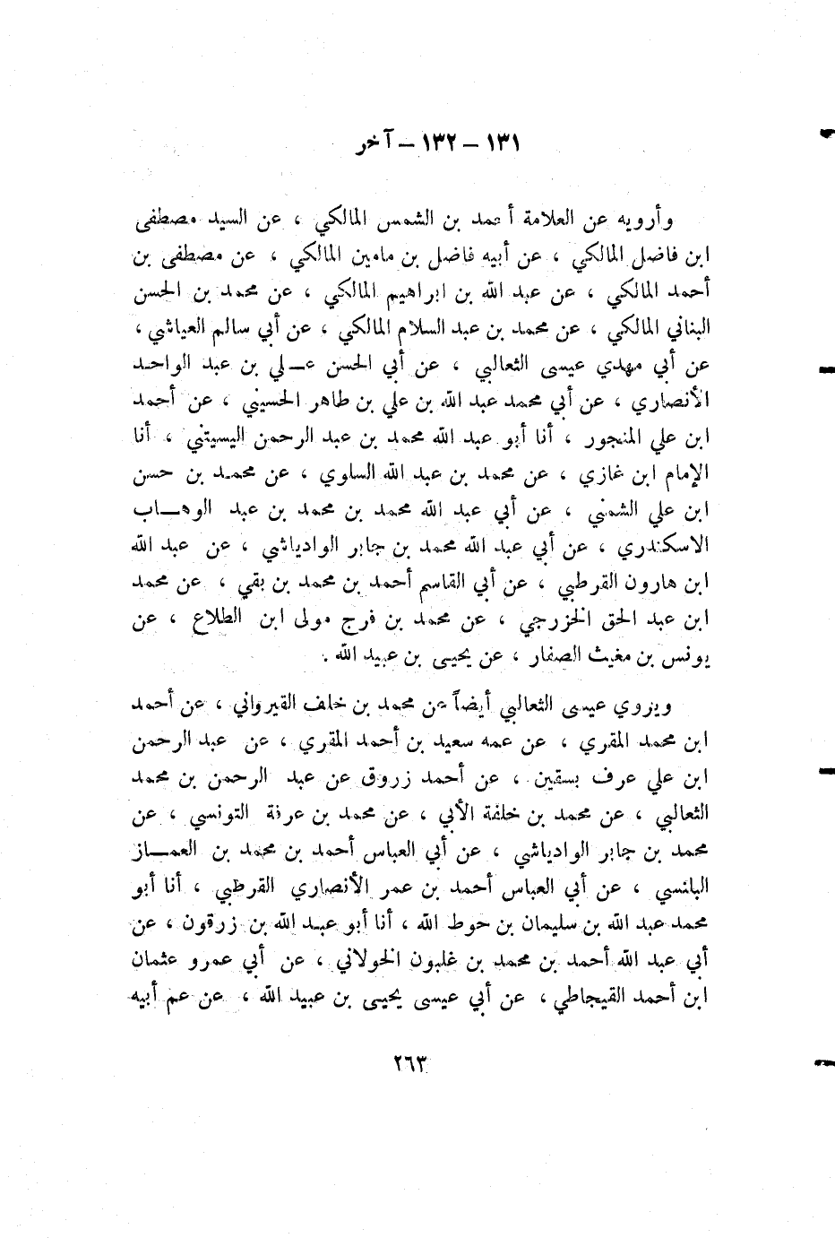 وأرويه عن العلامة أحمد بن الشمس المالكي، عن السيد مصطفى بن فاضل المالكي، عن أبيه فاضل بن مامين المالكي، عن مصطفى بن أحمد المالكي، عن عبد الله بن إبراهيم المالكي، عن محمد بن الحسن البناني المالكي، عن محمد بن عبد السلام المالكي، عن أبي سالم العياشي، عن أبي مهدي عيسى الثعالبي، عن أبي الحسن علي بن عبد الواحد الأنصاري، عن أبي محمد عبد الله بن علي بن طاهر الحسيني، عن أحمد بن علي المنجور، أنا أبو عبد الله محمد بن عبد الرحمن اليسيتني، أنا الإمام ابن غازي، عن محمد بن عبد الله السلوي، عن محمد بن حسن بن علي الشمني، عن أبي عبد الله محمد بن محمد بن عبد الوهاب الاسكندري، عن أبي عبد الله محمد بن جابر الوادياشي، عن عبد الله بن هارون القرطبي، عن أبي القاسم أحمد بن محمد بن بقي، عن محمد بن عبد الحق الخزرجي، عن محمد بن فرج مولى ابن الطلاع، عن يونس بن مغيث الصفار، عن يحيى بن عبيد الله.