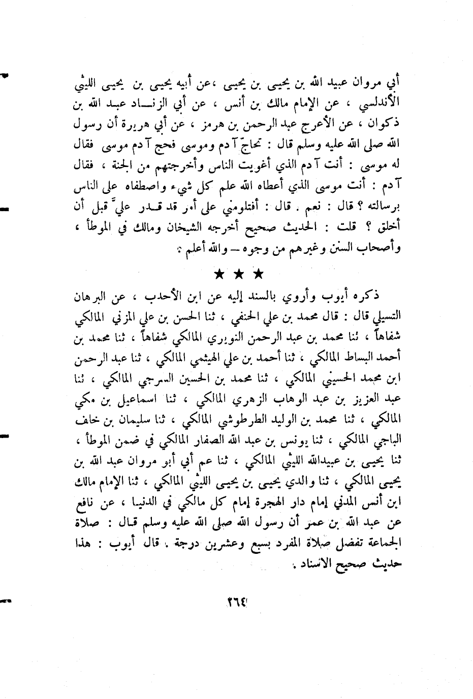 أبي مروان عبيد الله بن يحيى بن يحيى، عن أبيه يحيى بن يحيى الليثي الأندلسي، عن الإمام مالك بن أنس، عن أبي الزناد عبد الله بن ذكوان، عن الأعرج عبد الرحمن بن هرمز، عن أبي هريرة أن رسول الله صلى الله عليه وسلم قال: تحاجّ آدم وموسى فحج آدم موسى فقال له موسى: أنت آدم الذي أغويت الناس وأخرجتهم من الجنة، فقال آدم: أنت موسى الذي أعطاه الله علم كل شيء واصطفاه على الناس برسالته؟ قال: نعم. قال: أفتلومني على أمر قد قدر عليّ قبل أن أخلق؟ قلت: الحديث صحيح أخرجه الشيخان ومالك في الموطأ، وأصحاب السنن وغيرهم من وجوه - والله أعلم.