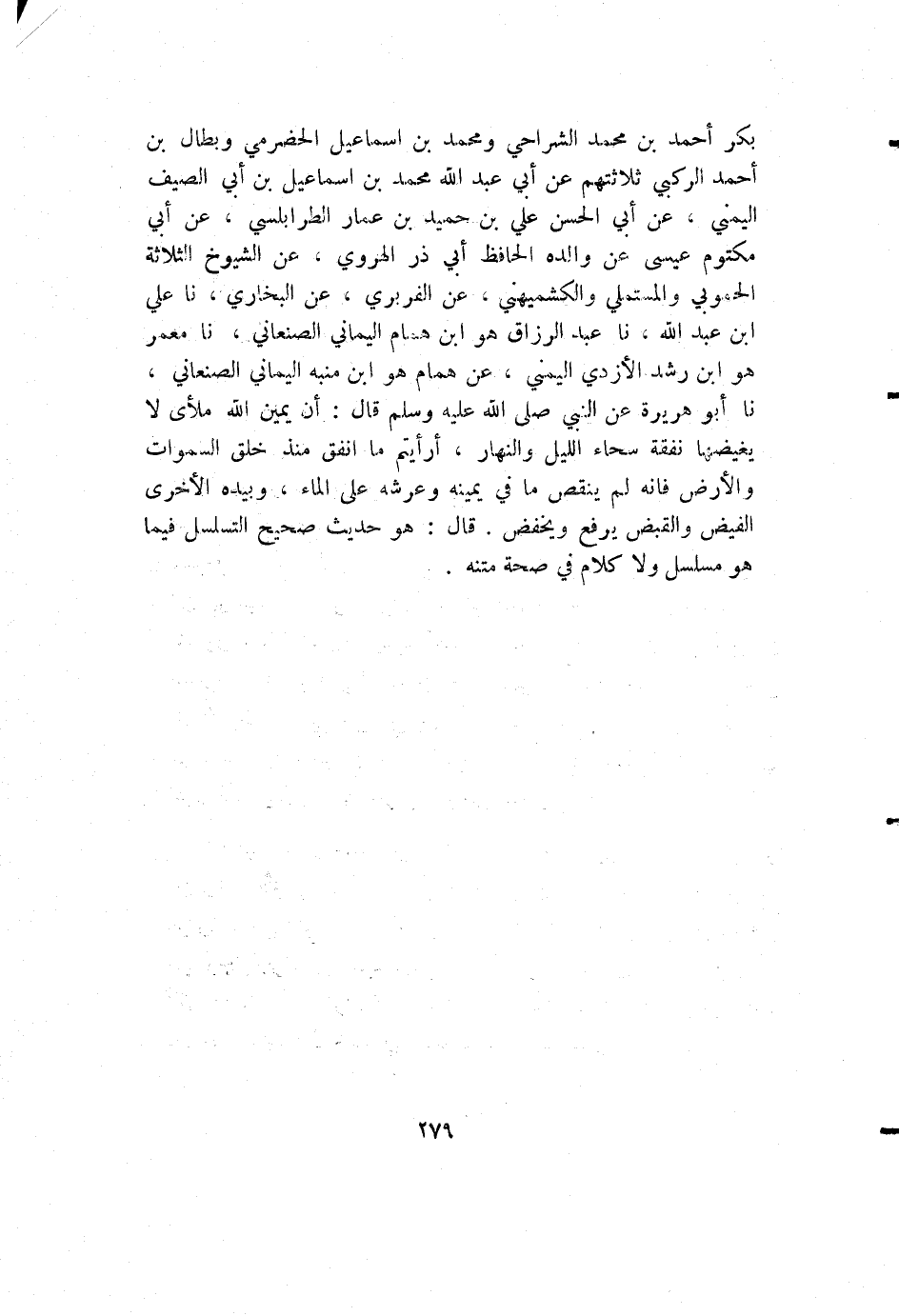 بكر أحمد بن محمد الشراحي ومحمد بن إسماعيل الحضرمي وبطال بن أحمد الركبي ثلاثتهم عن أبي عبد الله محمد بن إسماعيل بن أبي الصيف اليمني، عن أبي الحسن علي بن حميد بن عمار الطرابلسي، عن أبي مكتوم عيسى عن والده الحافظ أبي ذر الهروي، عن الشيوخ الثلاثة الحموبي والمستملي والكشميهني، عن الفربري، عن البخاري، نا علي بن عبد الله، نا عبد الرزاق هو ابن همام اليماني الصنعاني، نا معمر هو ابن رشد الأزدي اليمني، عن همام هو ابن منبه اليماني الصنعاني، نا أبو هريرة عن النبي صلى الله عليه وسلم قال: أن يمين الله ملأى لا يغيضها نفقة سحاء الليل والنهار، أرأيتم ما أنفق منذ خلق السموات والأرض فإنه لم ينقص ما في يمينه وعرشه على الماء، وبيده الأخرى الفيض والقبض يرفع ويخفض. قال: هو حديث صحيح التسلسل فيما هو مسلسل ولا كلام في صحة متنه.
