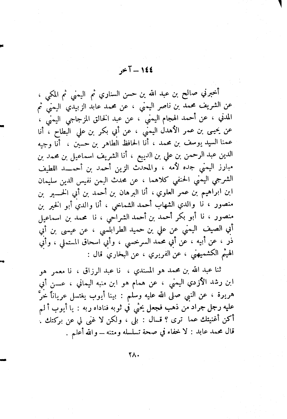 ثنا عبد الله بن محمد هو المسندي، نا عبد الرزاق، نا معمر هو ابن رشد الأزدي اليمني، عن همام هو ابن منبه اليماني، عن أبي هريرة، عن النبي صلى الله عليه وسلم: بينا أيوب يغتسل عريانا خرّ عليه رجل جراد من ذهب فجعل يحثي في ثوبه فناداه ربه: يا أيوب ألم أكن أغنيتك عما ترى؟ قال: بلى، ولكن لا غنى لي عن بركتك. قال محمد عابد: لا خفاء في صحة تسلسله ومتنه - والله أعلم.