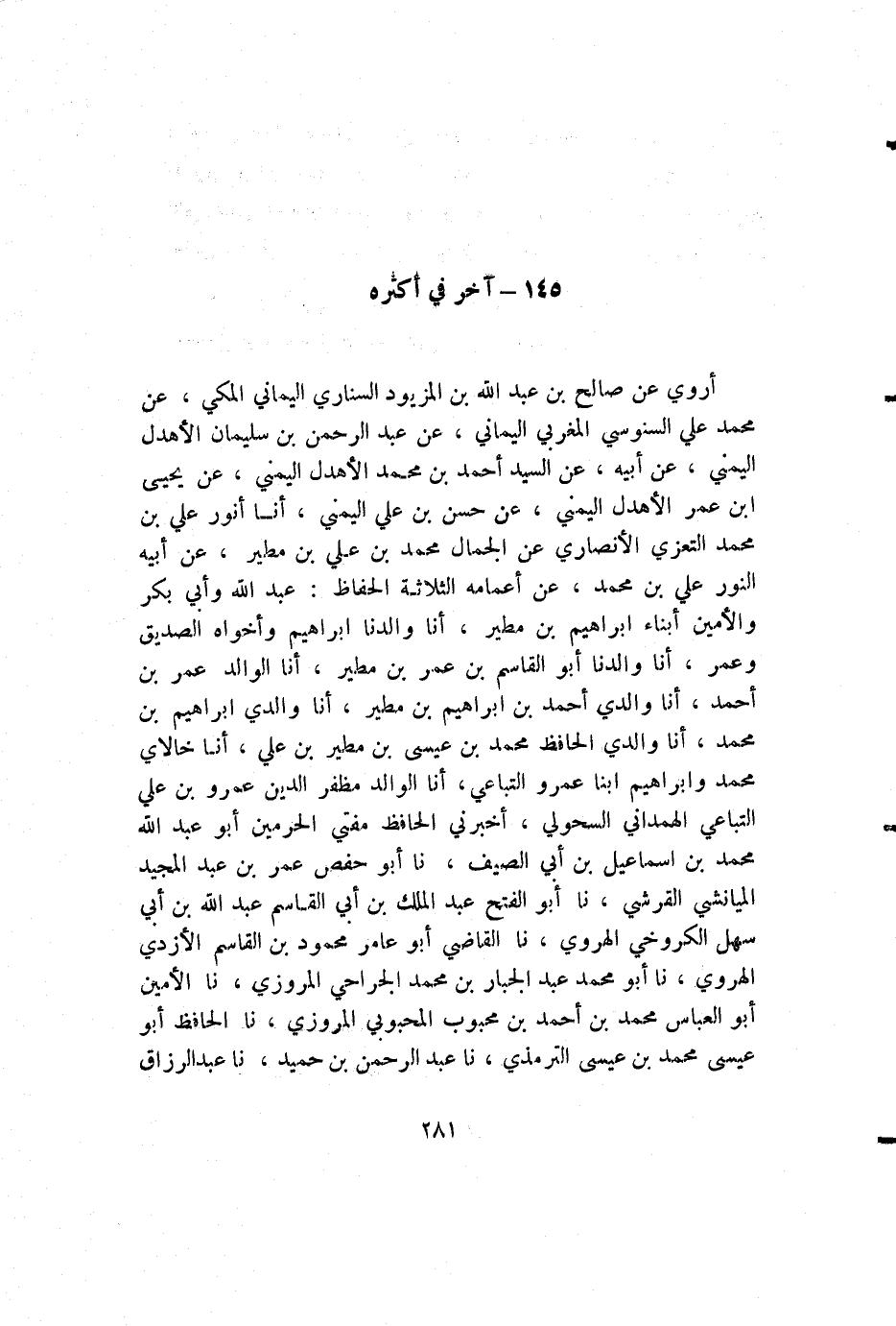 أروي عن صالح بن عبد الله بن المزيود السناري اليماني المكي، عن محمد علي السنوسي المغربي اليماني، عن عبد الرحمن بن سليمان الأهدل اليمني، عن أبيه، عن السيد أحمد بن محمد الأهدل اليمني، عن يحيى بن عمر الأهدل اليمني، عن حسن بن علي اليمني، أنا أنور علي بن محمد التعزي الأنصاري عن الجمال محمد بن علي بن مطير، عن أبيه النور علي بن محمد، عن أعمامه الثلاثة الحافظ: عبد الله وأبي بكر والأمين أبناء إبراهيم بن مطير، أنا والدنا إبراهيم وأخواه الصديق وعمر، أنا والدنا أبو القاسم بن عمر بن مطير، أنا الوالد عمر بن أحمد، أنا والدي أحمد بن إبراهيم بن مطير، أنا والدي إبراهيم بن محمد، أنا والدي الحافظ محمد بن عيسى بن مطير بن علي، أنا خالاي محمد وإبراهيم ابنا عمرو التباعي، أنا الوالد مظفر الدين عمرو بن علي التباعي الهمداني السحولي، أخبرني الحافظ مفتي الحرمين أبو عبد الله محمد بن إسماعيل بن أبي الصيف، نا أبو حفص عمر بن عبد المجيد الميانشي القرشي، نا أبو الفتح عبد الملك بن أبي القاسم عبد الله بن أبي سهل الكروخي الهروي، نا القاضي أبو عامر محمود بن القاسم الأزدي الهروي، نا أبو محمد عبد الجبار بن محمد الجراحي المروزي، نا الأمين أبو العباس محمد بن أحمد بن محبوب المحبوبي المروزي، نا الحافظ أبو عيسى محمد بن عيسى الترمذي، نا عبد الرحمن بن حميد، نا عبد الرزاق
