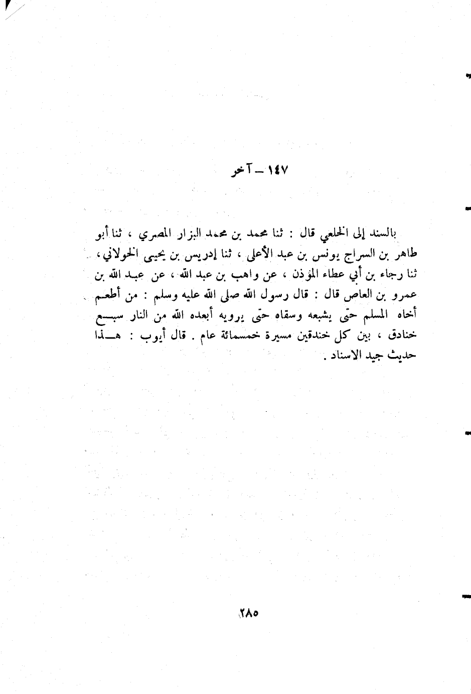 بالسند إلى الخلعي قال: ثنا محمد بن محمد البزار المصري، ثنا أبو طاهر بن السراج يونس بن عبد الأعلى، ثنا إدريس بن يحيى الخولاني، ثنا رجاء بن أبي عطاء المؤذن، عن واهب بن عبد الله، عن عبد الله بن عمرو بن العاص قال: قال رسول الله صلى الله عليه وسلم: من أطعم أخاه المسلم حتى يشبعه وسقاه حتى يرويه أبعده الله من النار سبع خنادق، بين كل خندقين مسيرة خمسمائة عام. قال أيوب: هذا حديث جيد الإسناد.
