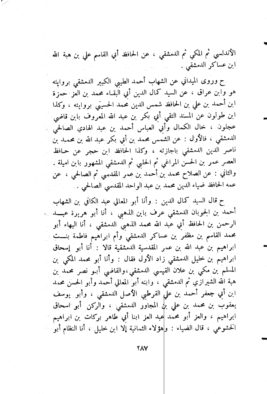 ح وروى الميداني عن الشهاب أحمد الطيبي الكبير الدمشقي بروايته هو وابن عراق، عن السيد كمال الدين أبي البقاء محمد بن العز حمزة بن أحمد بن علي بن الحافظ شمس الدين محمد الحسيني بروايته، وكذا ابن طولون عن المسند التقي أبي بكر بن عبد الله المعروف بابن قاضي عجلون، خال الكمال وأبي العباس أحمد بن عبد الهادي الصالحي الدمشقي، فالأول: عن الشمس محمد بن أبي بكر عبد الله بن محمد بن ناصر الدين الدمشقي بإجازته، وكذا الحافظ ابن حجر عن حافظ العصر عمر بن الحسن المراغي ثم الحلبي ثم الدمشقي المشهور بابن أميلة. والثاني: عن الصلاح محمد بن أحمد بن عمر المقدسي ثم الصالحي، عن عمه الحافظ ضياء الدين محمد بن عبد الواحد المقدسي الصالحي.