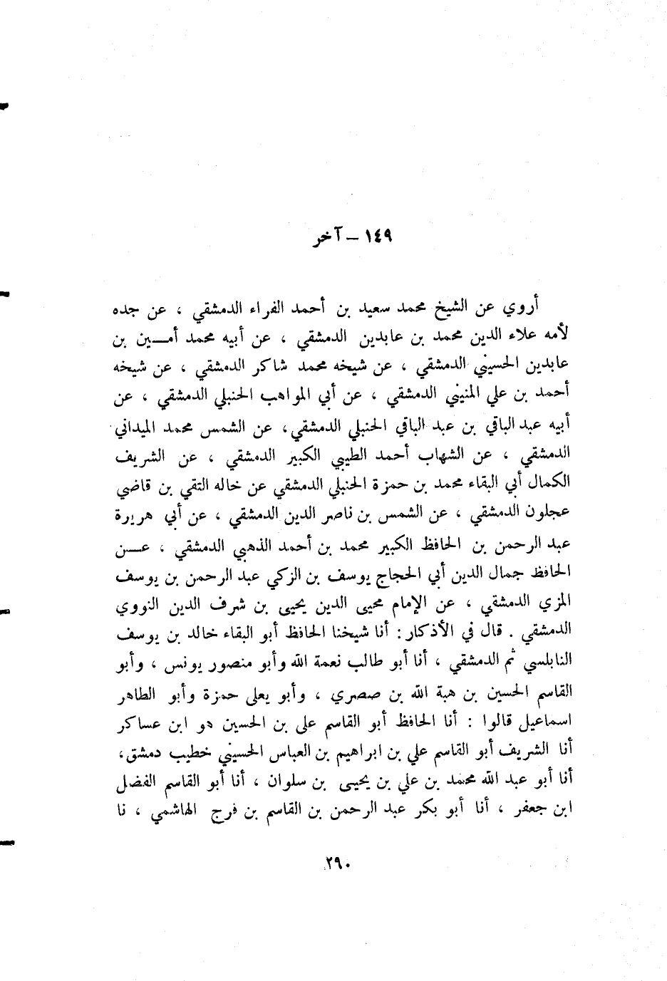 أروي عن الشيخ محمد سعيد بن أحمد الفراء الدمشقي، عن جده لأمه علاء الدين محمد بن عابدين الدمشقي، عن أبيه محمد أمين بن عابدين الحسيني الدمشقي، عن شيخه محمد شاكر الدمشقي، عن شيخه أحمد بن علي المنيني الدمشقي، عن أبي المواهب الحنبلي الدمشقي، عن أبيه عبد الباقي بن عبد الباقي الحنبلي الدمشقي، عن الشمس محمد الميداني الدمشقي، عن الشهاب أحمد الطيبي الكبير الدمشقي، عن الشريف الكمال أبي البقاء محمد بن حمزة الحنبلي الدمشقي عن خاله التقي بن قاضي عجلون الدمشقي، عن الشمس بن ناصر الدين الدمشقي، عن أبي هريرة عبد الرحمن بن الحافظ الكبير محمد بن أحمد الذهبي الدمشقي، عن الحافظ جمال الدين أبي الحجاج يوسف بن الزكي عبد الرحمن بن يوسف المزي الدمشقي، عن الإمام محيي الدين يحيى بن شرف الدين النووي الدمشقي. قال في الأذكار: أنا شيخنا الحافظ أبو البقاء خالد بن يوسف النابلسي ثم الدمشقي، أنا أبو طالب نعمة الله وأبو منصور يونس، وأبو القاسم الحسين بن هبة الله بن صصري، وأبو يعلى حمزة وأبو الطاهر إسماعيل قالوا: أنا الحافظ أبو القاسم علي بن الحسين هو ابن عساكر أنا الشريف أبو القاسم علي بن إبراهيم بن العباس الحسيني خطيب دمشق، أنا أبو عبد الله محمد بن علي بن يحيى بن سلوان، أنا أبو القاسم الفضل بن جعفر، أنا أبو بكر عبد الرحمن بن القاسم بن فرج الهاشمي، نا