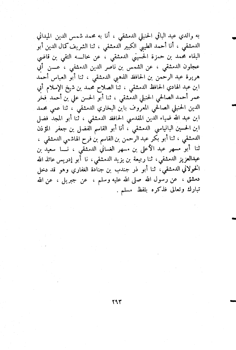 به والدي عبد الباقي الحنبلي الدمشقي، أنا به محمد شمس الدين الميداني الدمشقي، أنا أحمد الطيبي الكبير الدمشقي، ثنا الشريف كمال الدين أبو البقاء محمد بن حمزة الحسيني الدمشقي، عن خاله التقي بن قاضي عجلون الدمشقي، عن الشمس بن ناصر الدين الدمشقي، عن أبي هريرة عبد الرحمن بن الحافظ الذهبي الدمشقي، ثنا أبو العباس أحمد بن عبد الهادي الحافظ الدمشقي، ثنا الصلاح محمد بن شيخ الإسلام أبي عمر أحمد الصالحي الحنبلي الدمشقي، ثنا أبو الحسن علي بن أحمد فخر الدين الحنبلي الصالحي المعروف بابن البخاري الدمشقي، ثنا عمي محمد بن عبد الله ضياء الدين المقدسي الحافظ الدمشقي، ثنا أبو المجد فضل بن الحسين البانياسي الدمشقي، أنا أبو القاسم الفضل بن جعفر المؤذن الدمشقي، ثنا أبو بكر عبد الرحمن بن القاسم بن فرح الهاشمي الدمشقي، ثنا أبو مسهر عبد الأعلى بن مسهر الغساني الدمشقي، نا سعيد بن عبد العزيز الدمشقي، ثنا ربيعة بن يزيد الدمشقي، نا أبو إدريس عائذ الله الخولاني الدمشقي، ثنا أبو ذر جندب بن جنادة الغفاري وهو قد دخل دمشق، عن رسول الله صلى الله عليه وسلم، عن جبريل، عن الله تبارك وتعالى فذكره بلفظ مسلم.