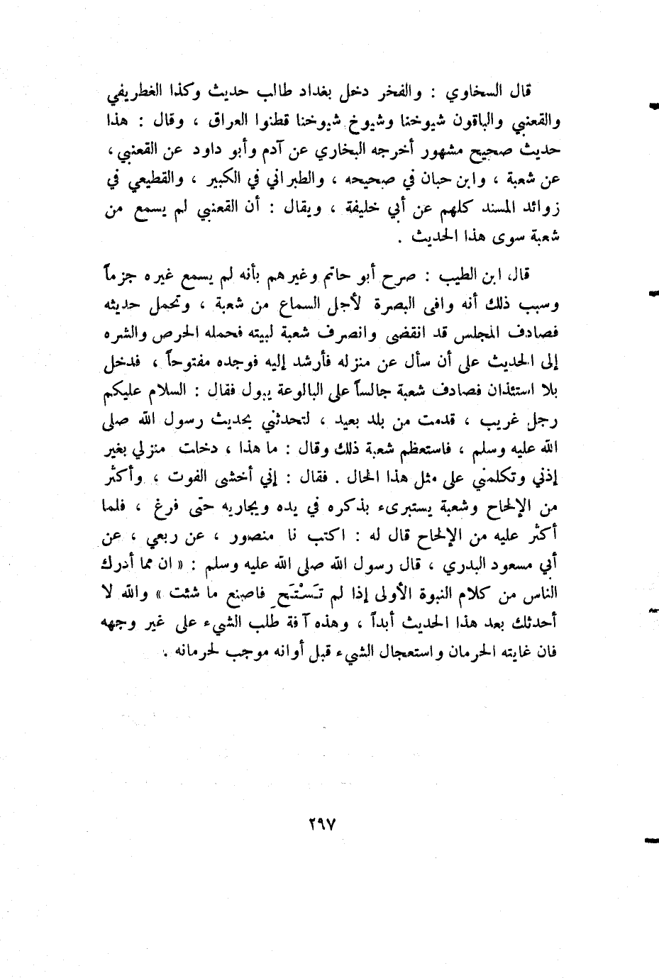 قال السخاوي: والفخر دخل بغداد طالب حديث وكذا الغطريفي والقعنبي والباقون شيوخنا وشيوخ شيوخنا قطنوا العراق، وقال: هذا حديث صحيح مشهور أخرجه البخاري عن آدم وأبو داود عن القعنبي، عن شعبة، وابن حبان في صحيحه، والطبراني في الكبير، والقطيعي في زوائد المسند كلهم عن أبي خليفة، ويقال: أن القعنبي لم يسمع من شعبة سوى هذا الحديث.