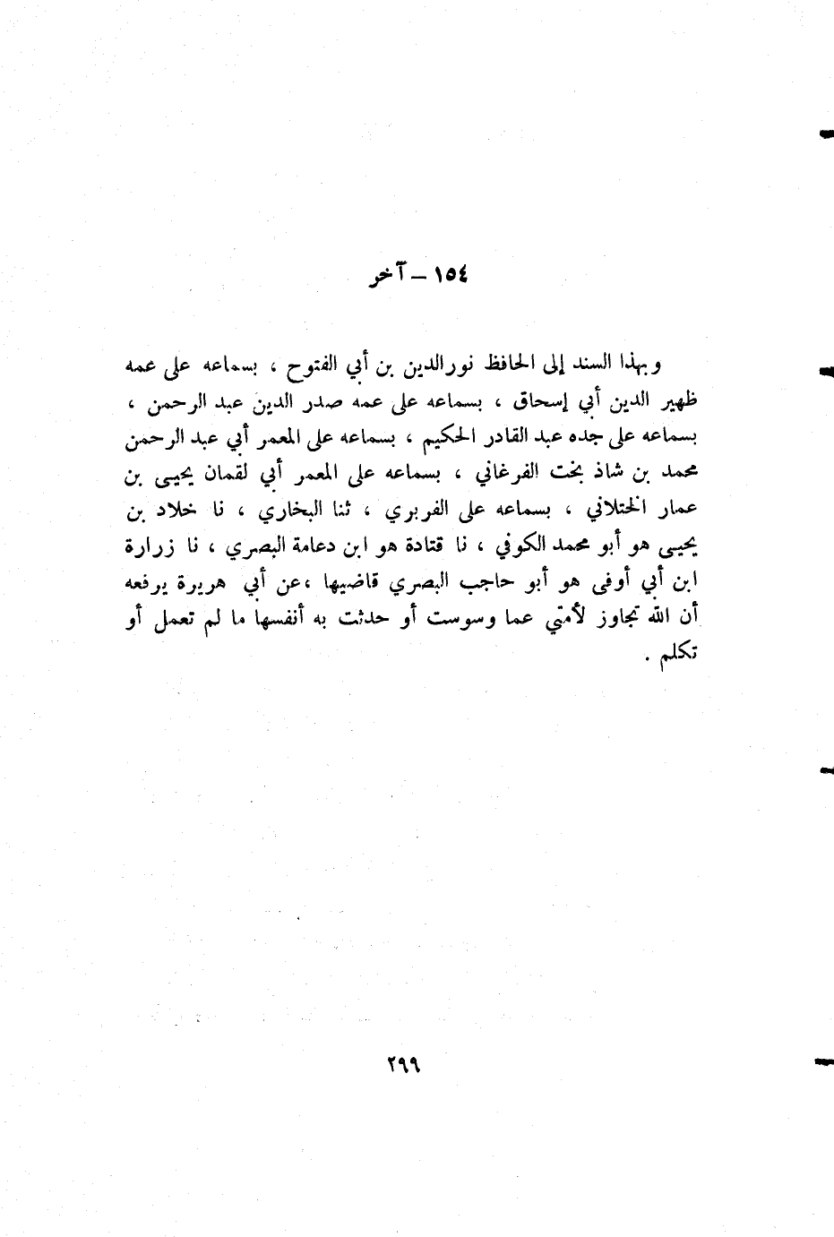 وبهذا السند إلى الحافظ نور الدين بن أبي الفتوح، بسماعه على عمه ظهير الدين أبي إسحاق، بسماعه على عمه صدر الدين عبد الرحمن، بسماعه على جده عبد القادر الحكيم، بسماعه على المعمر أبي عبد الرحمن محمد بن شاذ بخت الفرغاني، بسماعه على المعمر أبي لقمان يحيى بن عمار الختلاني، بسماعه على الفربري، ثنا البخاري، نا خلاد بن يحيى هو أبو محمد الكوفي، نا قتادة هو ابن دعامة البصري، نا زرارة ابن أبي أوفى هو أبو حاجب البصري قاضيها، عن أبي هريرة يرفعه أن الله تجاوز لأمتي عما وسوست أو حدثت به أنفسها ما لم تعمل أو تكلم.