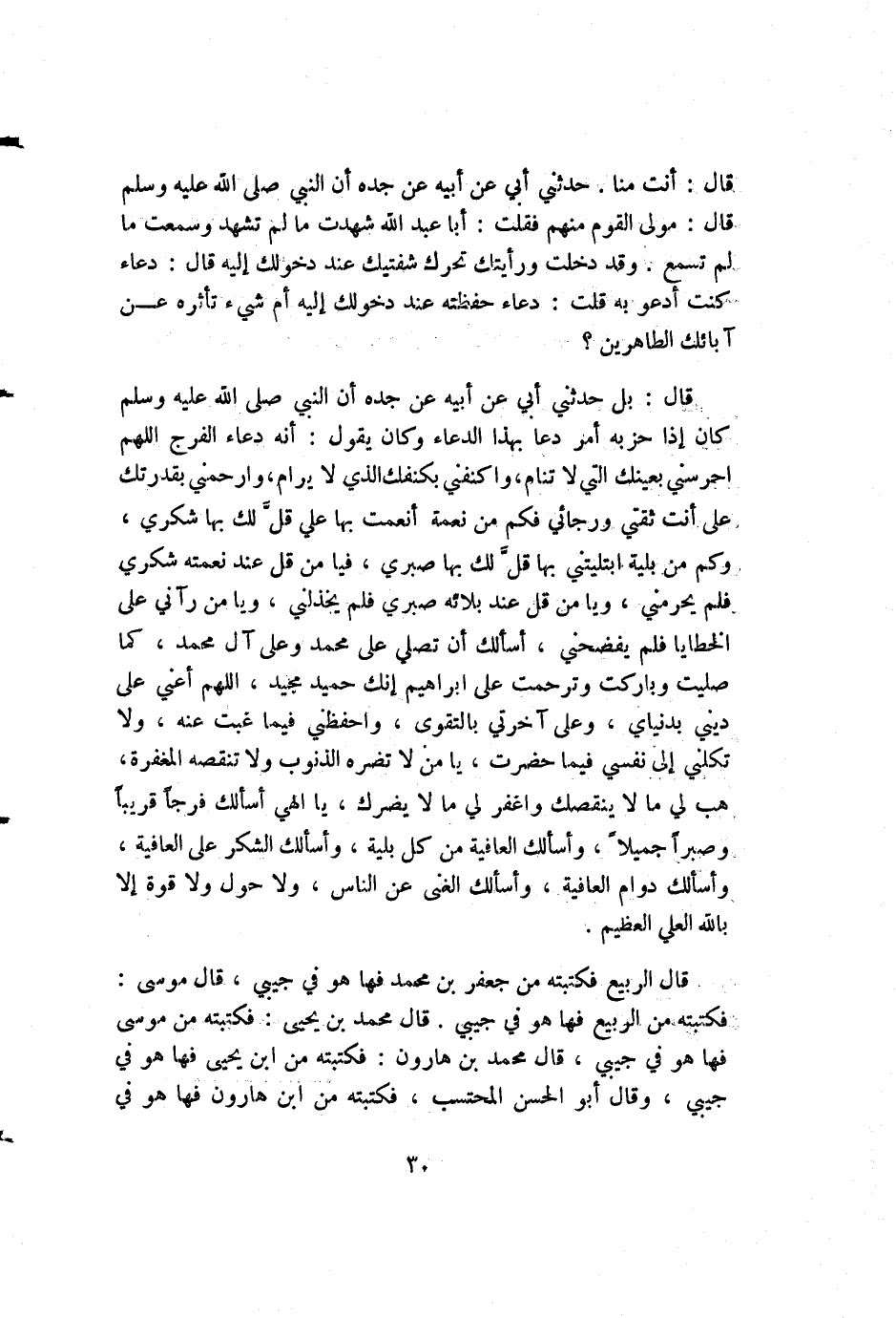 قال الربيع فكتبته من جعفر بن محمد فها هو في جيبي، قال موسى: فكتبته من الربيع فها هو في جيبي. قال محمد بن يحيى: فكتبته من موسى فها هو في جيبي، قال محمد بن هارون: فكتبته من ابن يحيى فها هو في جيبي، وقال أبو الحسن المحتسب، فكتبته من ابن هارون فها هو في