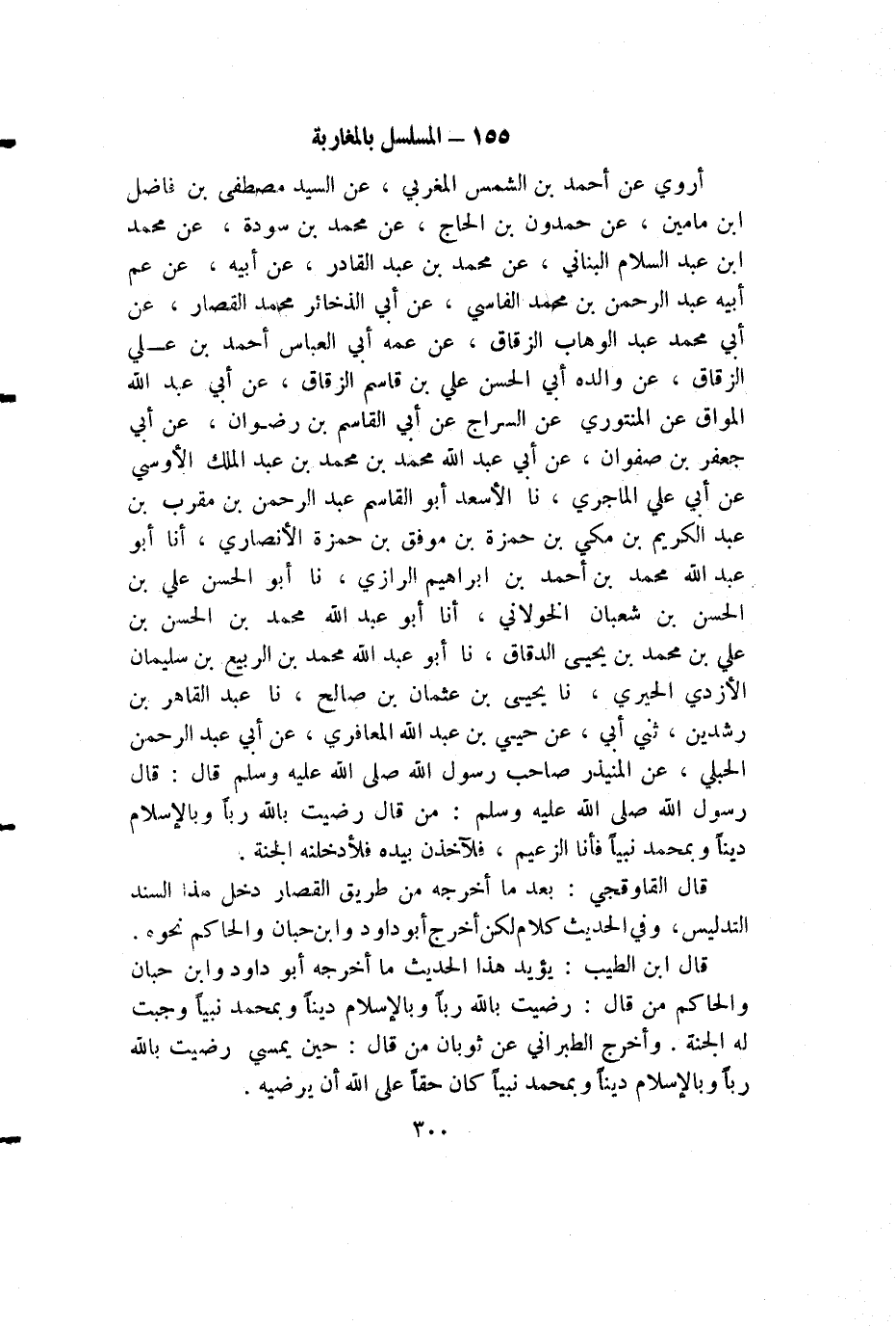 أروي عن أحمد بن الشمس المغربي، عن السيد مصطفى بن فاضل بن مامين، عن حمدون بن الحاج، عن محمد بن سودة، عن محمد بن عبد السلام البناني، عن محمد بن عبد القادر، عن أبيه، عن عم أبيه عبد الرحمن بن محمد الفاسي، عن أبي الذخائر محمد القصار، عن أبي محمد عبد الوهاب الزقاق، عن عمه أبي العباس أحمد بن علي الزقاق، عن والده أبي الحسن علي بن قاسم الزقاق، عن أبي عبد الله المواق عن المنتوري عن السراج عن أبي القاسم بن رضوان، عن أبي جعفر بن صفوان، عن أبي عبد الله محمد بن محمد بن عبد الملك الأوسي عن أبي علي الماجري، نا الأسعد أبو القاسم عبد الرحمن بن مقرب بن عبد الكريم بن مكي بن حمزة بن موفق بن حمزة الأنصاري، أنا أبو عبد الله محمد بن أحمد بن إبراهيم الرازي، نا أبو الحسن علي بن الحسن بن شعبان الخولاني، أنا أبو عبد الله محمد بن الحسن بن علي بن محمد بن يحيى الدقاق، نا أبو عبد الله محمد بن الربيع بن سليمان الأزدي الحيري، نا يحيى بن عثمان بن صالح، نا عبد القاهر بن رشدين، ثني أبي، عن حيي بن عبد الله المعافري، عن أبي عبد الرحمن الحبلي، عن المنيذر صاحب رسول الله صلى الله عليه وسلم قال: قال رسول الله صلى الله عليه وسلم: من قال رضيت بالله ربا وبالإسلام دينا وبمحمد نبيا فأنا الزعيم، فلآخذن بيده فلأدخلنه الجنة.