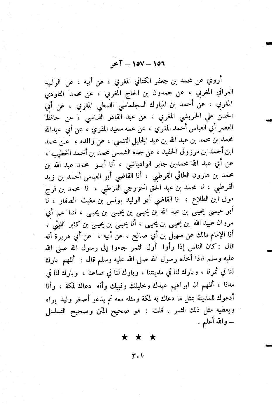أروي عن محمد بن جعفر الكتاني المغربي، عن أبيه، عن الوليد العراقي المغربي، عن حمدون بن الحاج المغربي، عن محمد التاودي المغربي، عن أحمد بن المبارك السجلماسي اللمطي المغربي، عن أبي الحسن علي الحريشي المغربي، عن عبد القادر الفاسي، عن حافظ العصر أبي العباس أحمد المقري، عن عمه سعيد المقري، عن أبي عبد الله محمد بن محمد بن عبد الله بن عبد الجليل التنسي، عن والده، عن محمد بن أحمد بن مرزوق الحفيد، عن جده الشمس محمد بن أحمد الخطيب، عن أبي عبد الله محمد بن جابر الوادياشي، أنا أبو محمد عبد الله بن محمد بن هارون الطائي القرطبي، أنا القاضي أبو العباس أحمد بن زيد القرطبي، نا محمد بن عبد الحق الخزرجي القرطبي، نا محمد بن فرج مولى ابن الطلاع، نا القاضي أبو الوليد يونس بن مغيث الصفار، نا أبو عيسى يحيى بن عبد الله بن يحيى بن يحيى بن يحيى، ثنا عم أبي مروان عبيد الله بن يحيى بن يحيى، أنا يحيى بن يحيى بن كثير الليثي، أنا الإمام مالك عن سهيل بن أبي صالح، عن أيبه، عن أبي هريرة أنه قال: كان الناس إذا رأوا أول الثمر جاءوا إلى رسول الله صلى الله عليه وسلم فإذا أخذه رسول الله صلى الله عليه وسلم قال: اللهم بارك لنا في ثمرنا، وبارك لنا في مدينتنا، وبارك لنا في صاعنا، وبارك لنا في مدنا، اللهم إن إبراهيم عبدك وخليلك ونبيك وأنه دعاك لمكة، وأنا أدعوك للمدينة بمثل ما دعاك به لمكة ومثله معه ثم يدعو أصغر وليد يراه ويعطيه مثل ذلك الثمر. قلت: هو صحيح المتن وصحيح التسلسل - والله أعلم.