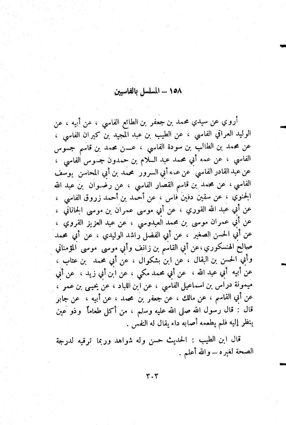 أروي عن سيدي محمد بن جعفر بن الطائع الفاسي، عن أبيه، عن الوليد العراقي الفاسي، عن الطيب بن عبد المجيد بن كيران الفاسي، عن محمد بن الطالب بن سودة الفاسي، عن محمد بن قاسم جسوس الفاسي، عن عمه أبي محمد عبد السلام بن حمدون جسوس الفاسي، عن عبد القادر الفاسي، عن عمه أبي السرور محمد بن أبي المحاسن يوسف الفاسي، عن محمد بن قاسم القصار الفاسي، عن رضوان بن عبد الله الجنوي، عن سقين دفين فاس، عن أحمد بن أحمد زروق الفاسي، عن أبي عبد الله القوري، عن أبي موسى عمران بن موسى الجاناني، عن أبي عمران موسى بن محمد العبدوسي، عن عبد العزيز القروي، عن أبي الحسن الصغير، عن أبي الفضل راشد الوليدي، عن أبي محمد صالح الهنسكوري، عن أبي القاسم بن زانف وأبي موسى موسى المؤمناني وأبي الحسن بن البقال، عن ابن بشكوال، عن أبي محمد بن عتاب، عن أبيه أبي عبد الله، عن أبي محمد مكي، عن ابن أبي زيد، عن أبي ميمونة دراس بن إسماعيل الفاسي، عن ابن اللباد، عن يحيى بن عمر، عن أبي القاسم، عن مالك، عن جعفر بن محمد، عن أبيه، عن جابر قال: قال رسول الله صلى الله عليه وسلم، من أكل طعاما وذو عين ينظر إليه فلم يطعمه أصابه داء يقال له النفس.