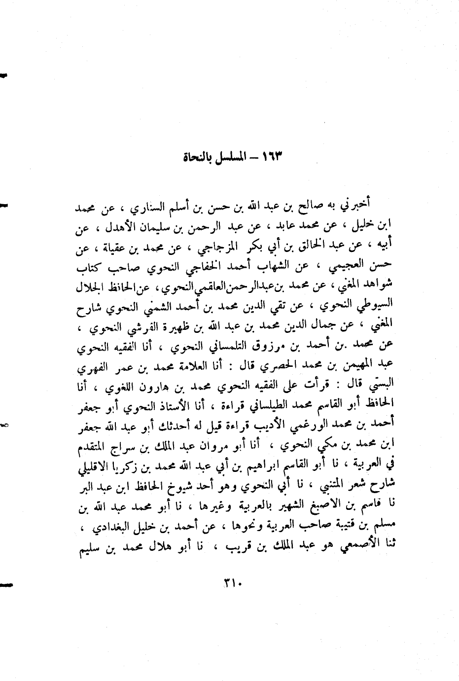 أخبرني به صالح بن عبد الله بن حسن بن أسلم السناري، عن محمد بن خليل، عن محمد عابد، عن عبد الرحمن بن سليمان الأهدل، عن أبيه، عن عبد الخالق بن أبي بكر المزجاجي، عن محمد بن عقيلة، عن حسن العجيمي، عن الشهاب أحمد الخفاجي النحوي صاحب كتاب شواهد المغني، عن محمد بن عبد الرحمن العلقمي النحوي، عن الحافظ الجلال السيوطي النحوي، عن تقي الدين محمد بن أحمد الشمني النحوي شارح المغني، عن جمال الدين محمد بن عبد الله بن ظهيرة القرشي النحوي، عن محمد بن أحمد بن مرزوق التلمساني النحوي، أنا الفقيه النحوي عبد المهيمن بن محمد الحصري قال: أنا العلامة محمد بن عمر الفهري البستي قال: قرأت على الفقيه النحوي محمد بن هارون اللغوي، أنا الحافظ أبو القاسم محمد الطيلساني قراءة، أنا الأستاذ النحوي أبو جعفر أحمد بن محمد الورغمي الأديب قراءة قيل له أحدثك أبو عبد الله جعفر بن محمد بن مكي النحوي، أنا أبو مروان عبد الملك بن سراج المتقدم في العربية، نا أبو القاسم إبراهيم بن أبي عبد الله محمد بن زكريا الإقليلي شارح شعر المتنبي، نا أبي النحوي وهو أحد شيوخ الحافظ ابن عبد البر نا قاسم بن الأصبغ الشهير بالعربية وغيرها، نا أبو محمد عبد الله بن مسلم بن قتيبة صاحب العربية ونحوها، عن أحمد بن خليل البغدادي، ثنا الأصمعي هو عبد الملك بن قريب، نا أبو هلال محمد بن سليم