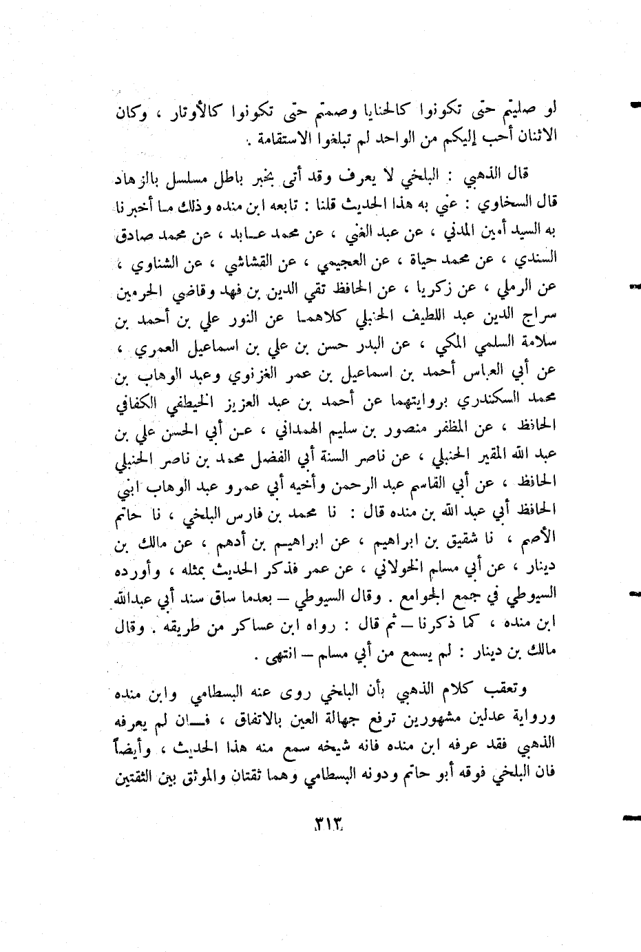 وتعقب كلام الذهبي بأن البلخي روى عنه البسطامي وابن منده ورواية عدلين مشهورين ترفع جهالة العين بالاتفاق، فإن لم يعرفه الذهبي فقد عرفه ابن منده فإنه شيخه سمع منه هذا الحديث، وأيضا فإن البلخي فوقه أبو حاتم ودونه البسطامي وهما ثقتان والموثق بين الثقتين