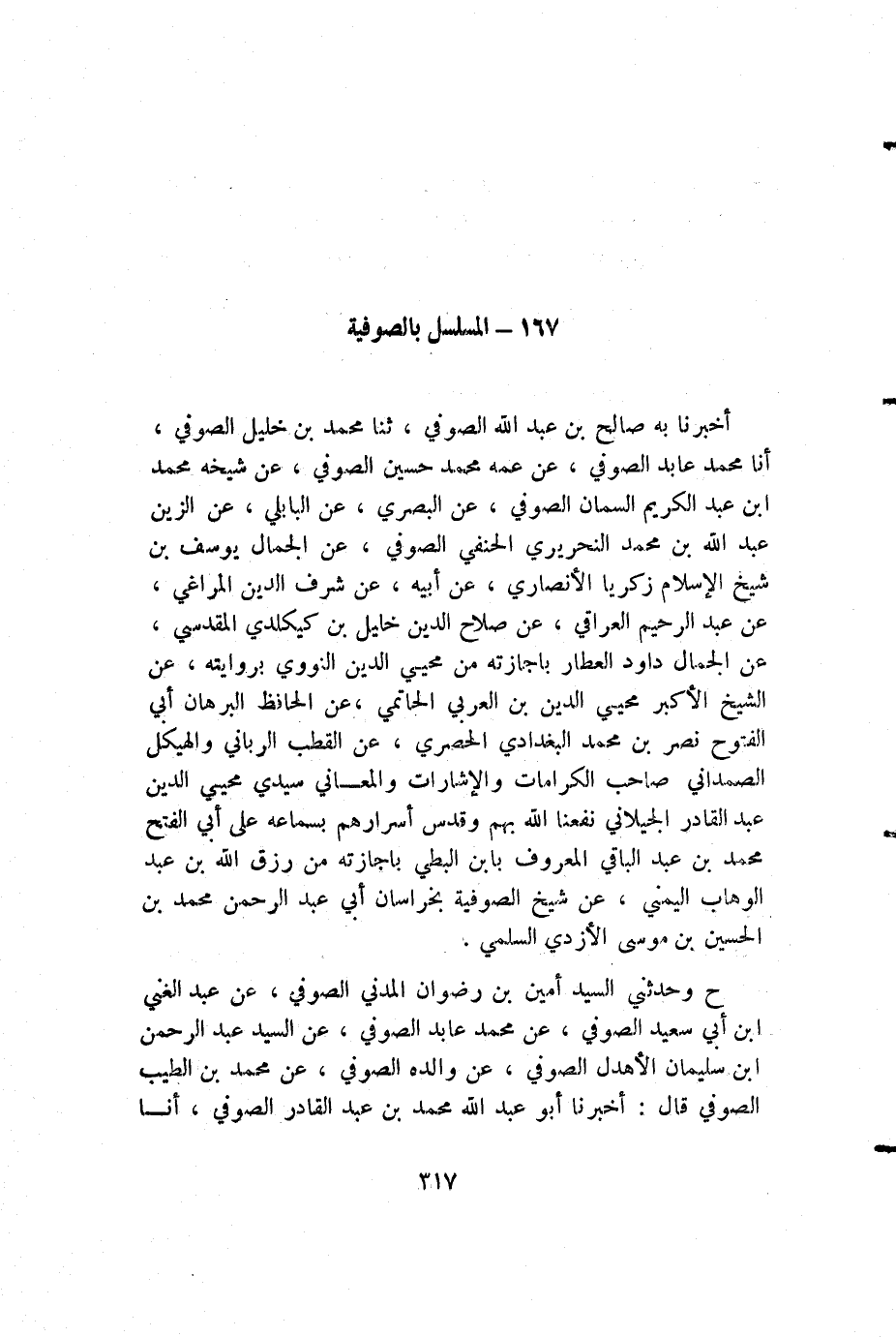 ح وحدثني السيد أمين بن رضوان المدني الصوفي، عن عبد الغني ابن أبي سعيد الصوفي، عن محمد عابد الصوفي، عن السيد عبد الرحمن بن سليمان الأهدل الصوفي، عن والده الصوفي، عن محمد بن الطيب الصوفي قال: أخبرنا أبو عبد الله محمد بن عبد القادر الصوفي، أنا