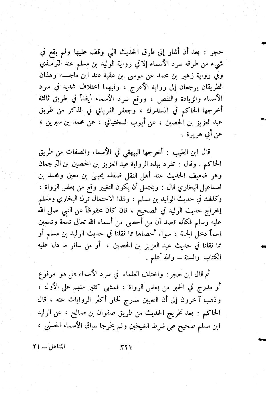 قال ابن الطيب: أخرجها البيهقي في الأسماء والصفات من طريق الحاكم. وقال: تفرد بهذه الرواية عبد العزيز بن الحصين بن الترجمان وهو ضعيف الحديث عند أهل النقل ضعفه يحيى بن معين ومحمد بن إسماعيل البخاري قال: ويحتمل أن يكون التغيير وقع من بعض الرواة، وكذلك في حديث الوليد بن مسلم، ولهذا الاحتمال ترك البخاري ومسلم إخراج حديث الوليد في الصحيح، فإن كان محفوظا عن النبي صلى الله عليه وسلم فكأنه قصد أن من أحصى من أسماء الله تعالى تسعة وتسعين اسما دخل الجنة، سواء أحصاها مما نقلنا في حديث الوليد بن مسلم أو مما نقلنا في حديث عبد العزيز بن الحصين، أو من سائر ما دل عليه الكتاب والسنة - والله أعلم.