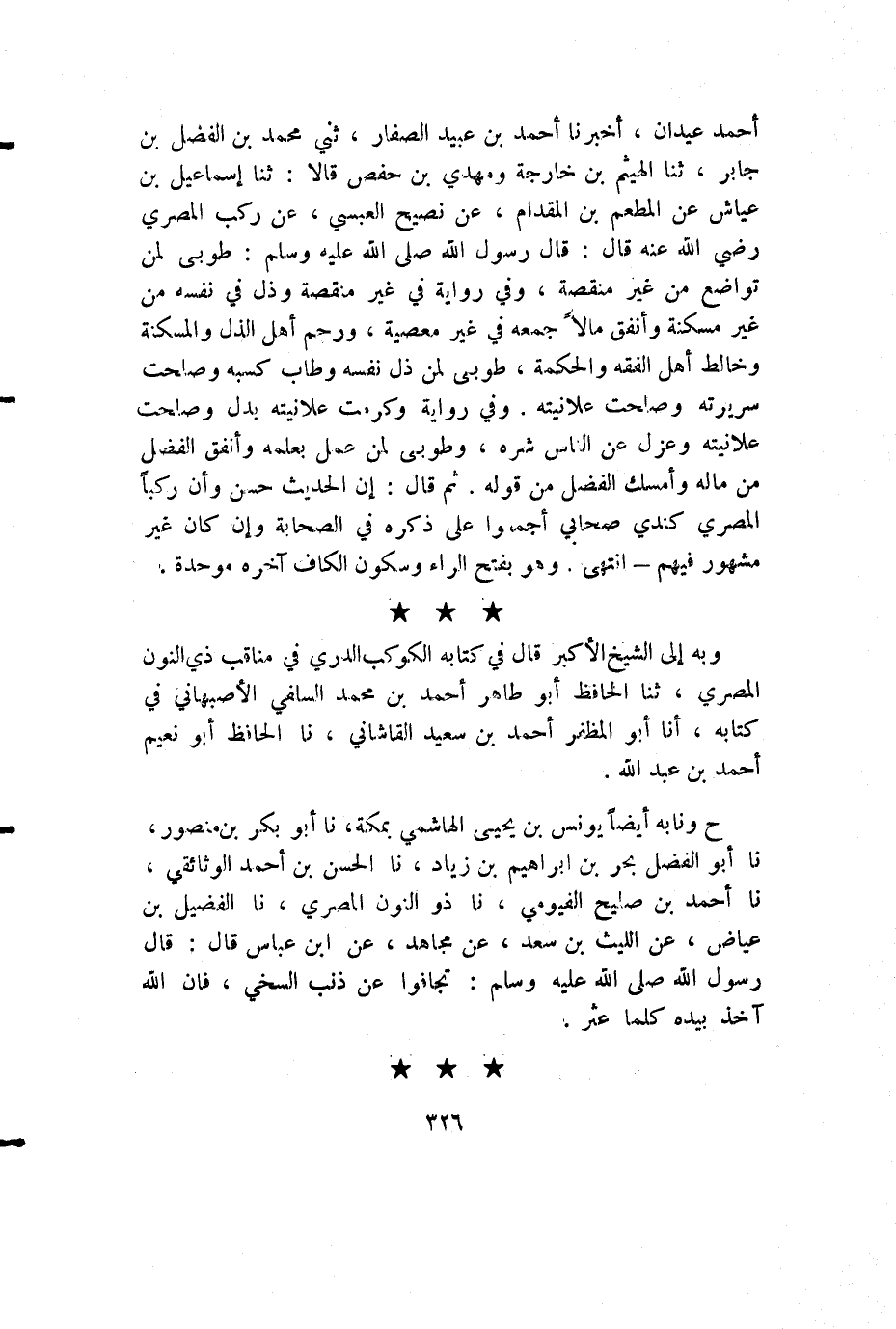 وبه إلى الشيخ الأكبر قال في كتابه الكوكب الدري في مناقب ذي النون المصري، ثنا الحافظ أبو طاهر أحمد بن محمد السلفي الأصبهاني في كتابه، أنا أبو المظفر أحمد بن سعيد القاشاني، نا الحافظ أبو نعيم أحمد بن عبد الله.