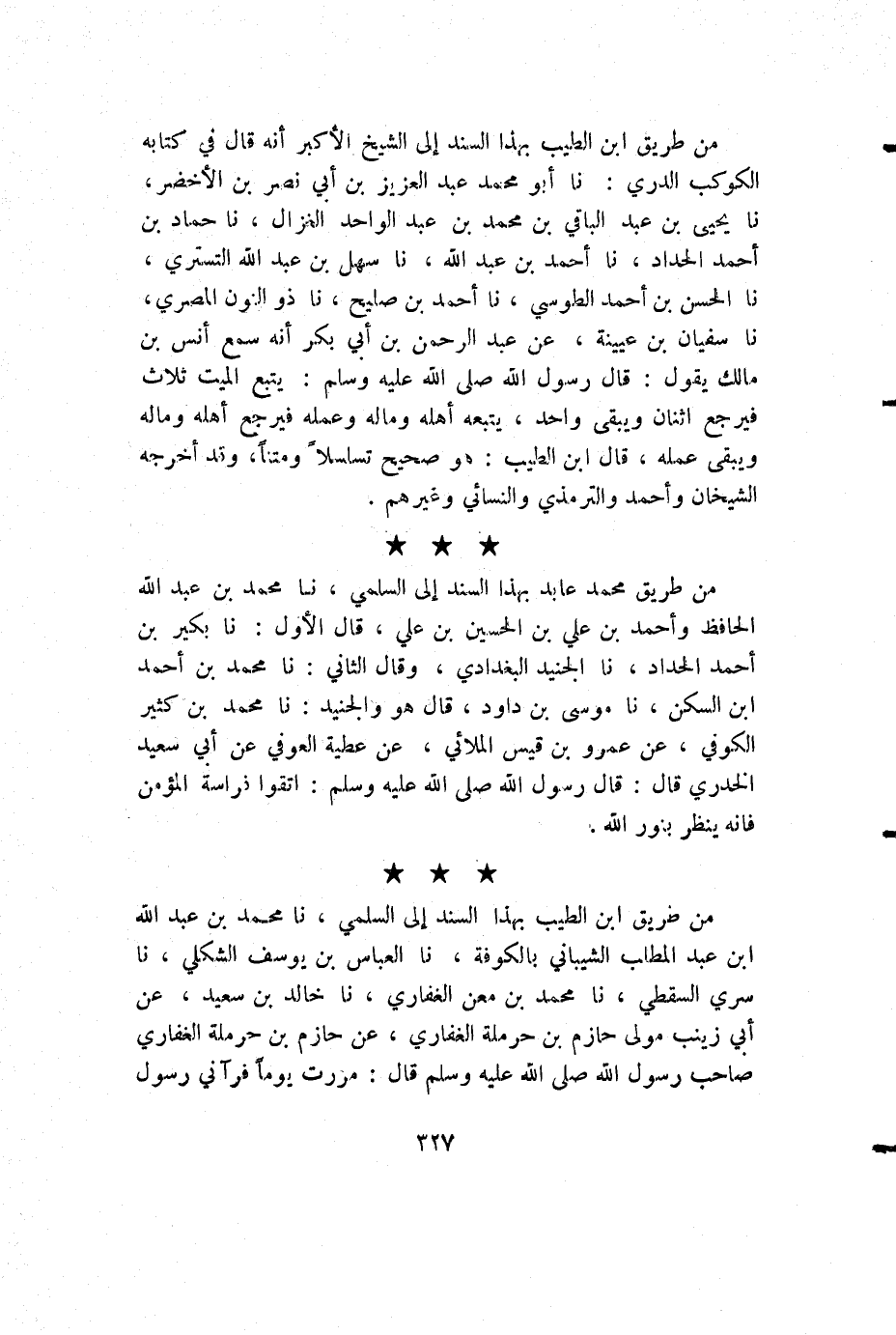 من طريق ابن الطيب بهذا السند إلى الشيخ الأكبر أنه قال في كتابه الكوكب الدري: نا أبو محمد عبد العزيز بن أبي نصر بن الأخضر، نا يحيى بن عبد الباقي بن محمد بن عبد الواحد الغزال، نا حماد بن أحمد الحداد، نا أحمد بن عبد الله، نا سهل بن عبد الله التستري، نا الحسن بن أحمد الطوسي، نا أحمد بن صليح، نا ذو النون المصري، نا سفيان بن عيينة، عن عبد الرحمن بن أبي بكر أنه سمع أنس بن مالك يقول: قال رسول الله صلى الله عليه وسلم: يتبع الميت ثلاث فيرجع اثنان ويبقى واحد، يتبعه أهله وماله وعمله فيرجع أهله وماله ويبقى عمله، قال ابن الطيب: هو صحيح تسلسلا ومتنا، وقد أخرجه الشيخان وأحمد والترمذي والنسائي وغيرهم.