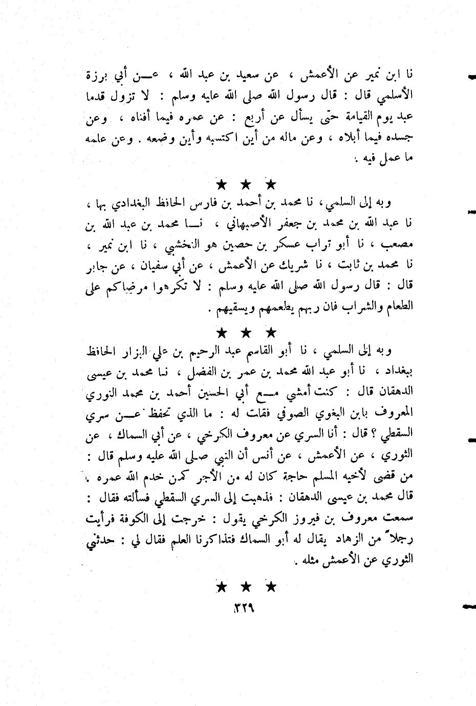 وبه إلى السلمي، نا أبو القاسم عبد الرحيم بن علي البزار الحافظ ببغداد، نا أبو عبد الله محمد بن عمر بن الفضل، نا محمد بن عيسى الدهقان قال: كنت أمشي مع أبي الحسين أحمد بن محمد النوري المعروف بابن البغوي الصوفي فقلت له: ما الذي تحفظ عن سري السقطي؟ قال: أنا السري عن معروف الكرخي، عن أبي السماك، عن الثوري، عن الأعمش، عن أنس أن النبي صلى الله عليه وسلم قال: من قضى لأخيه المسلم حاجة كان له من الأجر كمن خدم الله عمره. قال محمد بن عيسى الدهقان: فذهبت إلى السري السقطي فسألته فقال: سمعت معروف بن فيروز الكرخي يقول: خرجت إلى الكوفة فرأيت رجلاً من الزهاد يقال له أبو السماك فتذاكرنا العلم فقال لي: حدثني الثوري عن الأعمش مثله.