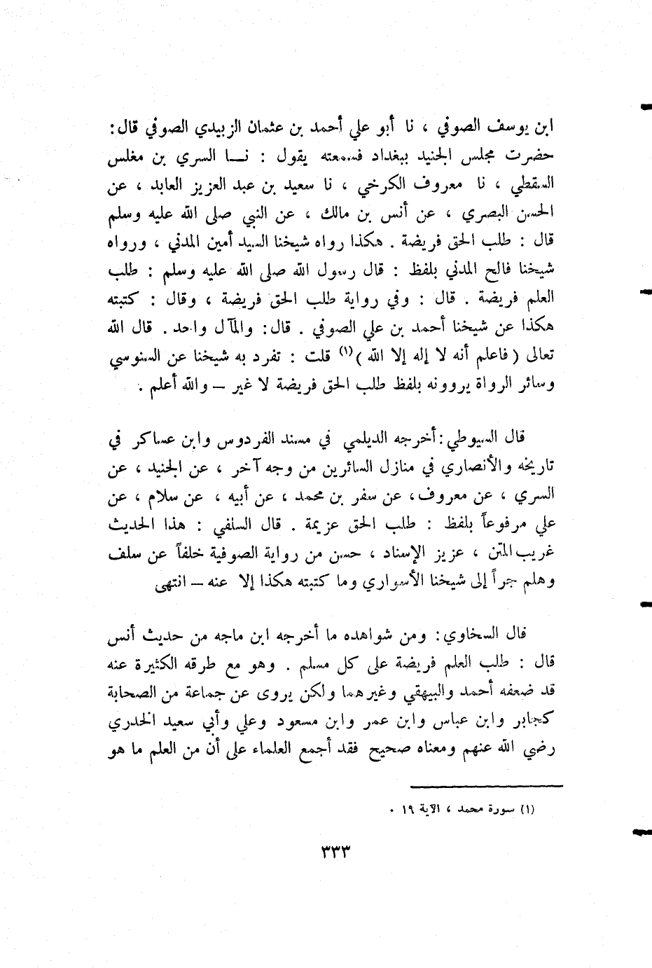 ابن يوسف الصوفي، نا أبو علي أحمد بن عثمان الزبيدي الصوفي قال: حضرت مجلس الجنيد ببغداد فسمعته يقول: نا السري بن مغلس السقطي، نا معروف الكرخي، نا سعيد بن عبد العزيز العابد، عن الحسن البصري، عن أنس بن مالك، عن النبي صلى الله عليه وسلم قال: طلب الحق فريضة. هكذا رواه شيخنا السيد أمين المدني، ورواه شيخنا فالح المدني بلفظ: قال رسول الله صلى الله عليه وسلم: طلب العلم فريضة. قال: وفي رواية طلب الحق فريضة، وقال: كتبته هكذا عن شيخنا أحمد بن علي الصوفي. قال: والمآل واحد. قال الله تعالى {فاعلم أنه لا إله إلا الله} قلت: تفرد به شيخنا عن السنوسي وسائر الرواة يروونه بلفظ طلب الحق فريضة لا غير - والله أعلم.