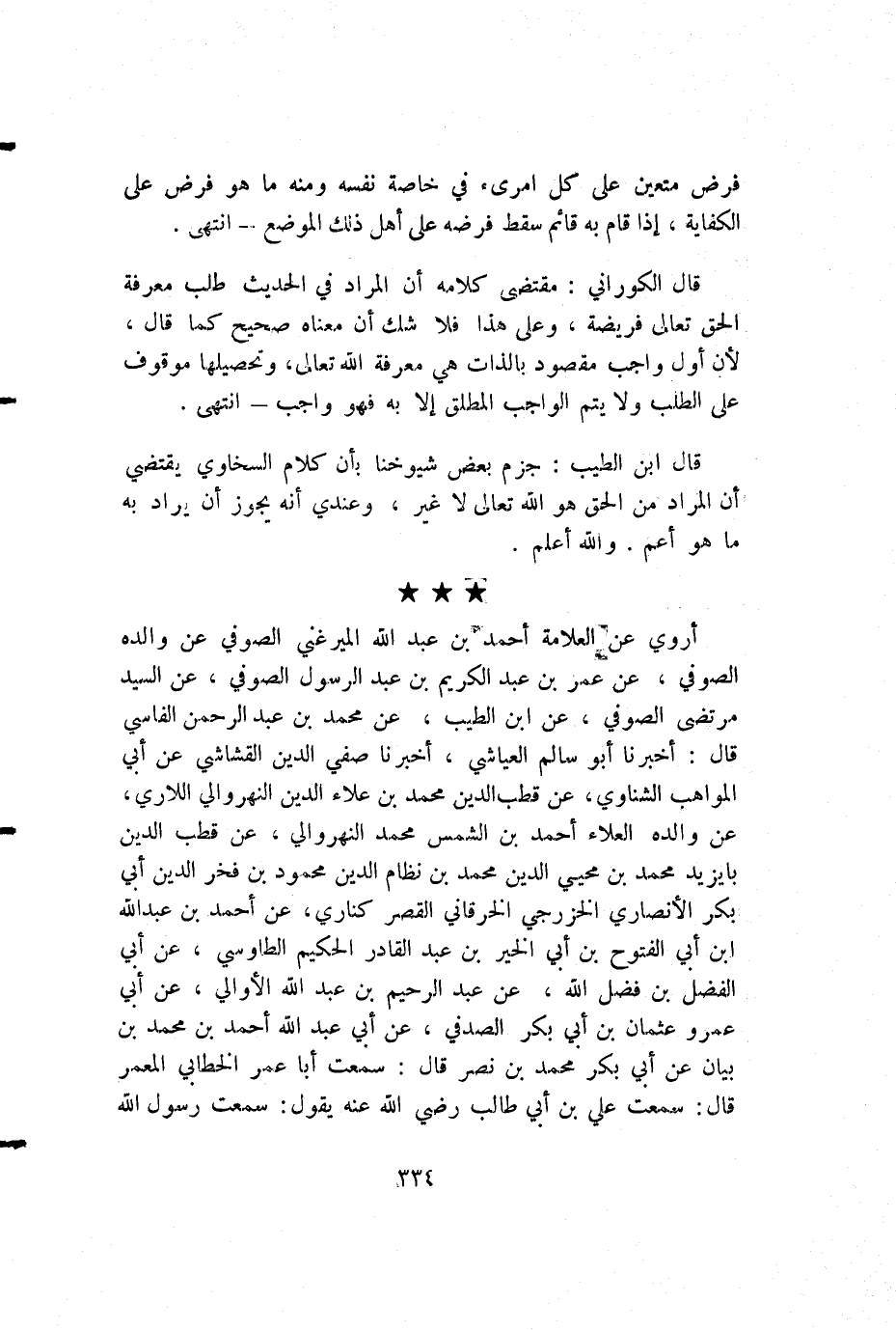 أروي عن العلامة أحمد بن عبد الله الميرغني الصوفي عن والده الصوفي، عن عمر بن عبد الكريم بن عبد الرسول الصوفي، عن السيد مرتضى الصوفي، عن ابن الطيب، عن محمد بن عبد الرحمن الفاسي قال: أخبرنا أبو سالم العياشي، أخبرنا صفي الدين القشاشي عن أبي المواهب الشناوي، عن قطب الدين محمد بن علاء الدين النهروالي اللاري، عن والده العلاء أحمد بن الشمس محمد النهروالي، عن قطب الدين بايزيد محمد بن محيي الدين محمد بن نظام الدين محمود بن فخر الدين أبي بكر الأنصاري الخزرجي الخرقاني القصر كناري، عن أحمد بن عبد الله ابن أبي الفتوح بن أبي الخير بن عبد القادر الحكيم الطاوسي، عن أبي الفضل بن فضل الله، عن عبد الرحيم بن عبد الله الأوالي، عن أبي عمرو عثمان بن أبي بكر الصدفي، عن أبي عبد الله أحمد بن محمد بن بيان عن أبي بكر محمد بن نصر قال: سمعت أبا عمر الخطابي المعمر قال: سمعت علي بن أبي طالب رضي الله عنه يقول: سمعت رسول الله