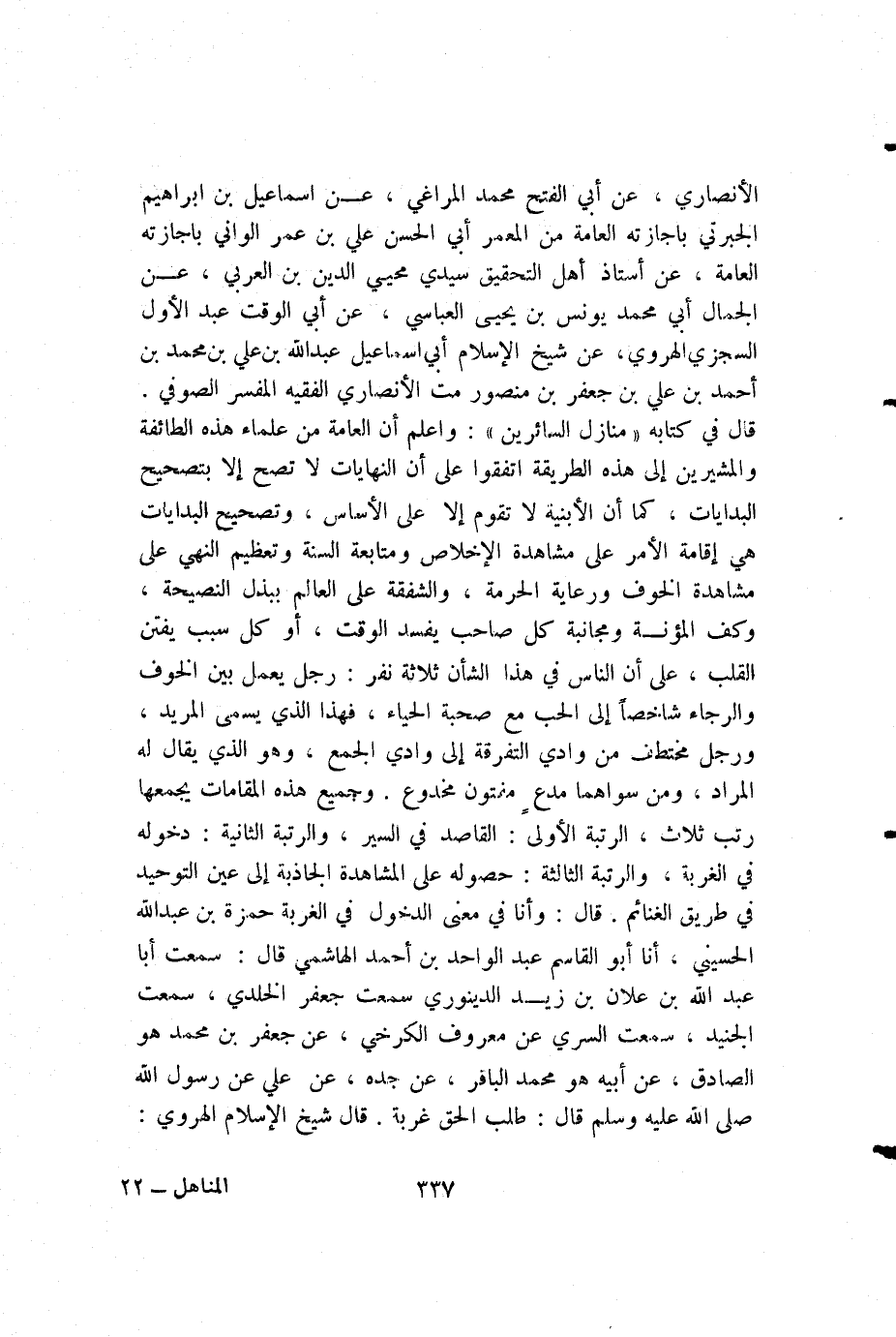 الأنصاري، عن أبي الفتح محمد المراغي، عن إسماعيل بن إبراهيم الجبرتي بإجازته العامة من المعمر أبي الحسن علي بن عمر الواني بإجازته العامة، عن أستاذ أهل التحقيق سيدي محيي الدين بن العربي، عن الجمال أبي محمد يونس بن يحيى العباسي، عن أبي الوقت عبد الأول السجزي الهروي، عن شيخ الإسلام أبي إسماعيل عبد الله بن علي بن محمد بن أحمد بن علي بن جعفر بن منصور مت الأنصاري الفقيه المفسر الصوفي. قال في كتابه «منازل السائرين»: واعلم أن العامة من علماء هذه الطائفة والمشيرين إلى هذه الطريقة اتفقوا على أن النهايات لا تصح إلا بتصحيح البدايات، كما أن الأبنية لا تقوم إلا على الأساس، وتصحيح البدايات هي إقامة الأمر على مشاهدة الإخلاص ومتابعة السنة وتعظيم النهي على مشاهدة الخوف ورعاية الحرمة، والشفقة على العالم ببذل النصيحة، وكف المؤنة ومجانبة كل صاحب يفسد الوقت، أو كل سبب يفتن القلب، على أن الناس في هذا الشأن ثلاثة نفر: رجل يعمل بين الخوف والرجاء شاخصا إلى الحب مع صحبة الحياء، فهذا الذي يسمى المريد، ورجل مختطف من وادي التفرقة إلى وادي الجمع، وهو الذي يقال له المراد، ومن سواهما مدع مفتون مخدوع. وجميع هذه المقامات يجمعها رتب ثلاث، الرتبة الأولى: القاصد في السير، والرتبة الثانية: دخوله في الغربة، والرتبة الثالثة: حصوله على المشاهدة الجاذبة إلى عين التوحيد في طريق الغنائم. قال: وأنا في معنى الدخول في الغربة حمزة بن عبد الله الحسيني، أنا أبو القاسم عبد الواحد بن أحمد الهاشمي قال: سمعت أبا عبد الله بن علان بن زيد الدينوري سمعت جعفر الخلدي، سمعت الجنيد، سمعت السري عن معروف الكرخي، عن جعفر بن محمد هو الصادق، عن أبيه هو محمد الباقر، عن جده، عن علي عن رسول الله صلى الله عليه وسلم قال: طلب الحق غربة. قال شيخ الإسلام الهروي: