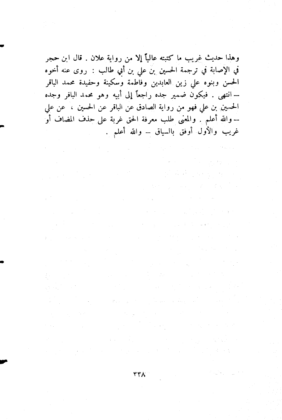 وهذا حديث غريب ما كتبته عاليا إلا من رواية علان. قال ابن حجر في الإصابة في ترجمة الحسين بن علي بن أبي طالب: روى عنه أخوه الحسن وبنوه علي زين العابدين وفاطمة وسكينة وحفيدة محمد الباقر - انتهى. فيكون ضمير جده راجعا إلى أبيه وهو محمد الباقر وجده الحسين بن علي فهو من رواية الصادق عن الباقر عن الحسين، عن علي - والله أعلم. والمعنى طلب معرفة الحق غربة على حذف المضاف أو غريب والأول أوفق بالسياق - والله أعلم.