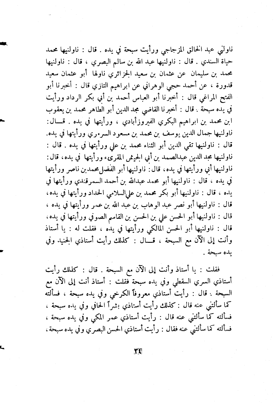 ناولني عبد الخالق المزجاجي ورأيت سبحة في يده. قال: ناولنيها محمد حياة السندي. قال: ناولنيها عبد الله بن سالم البصري، قال: ناولنيها محمد بن سليمان عن عثمان بن سعيد الجزائري ناولها أبو عثمان سعيد قدورة، عن أحمد حجي الوهراني عن إبراهيم التازي قال: أخبرنا أبو الفتح المراغي قال: أخبرنا أبو العباس أحمد بن أبي بكر الرداد ورأيت في يده سبحة. قال: أخبرنا القاضي مجد الدين أبو الطاهر محمد بن يعقوب بن محمد بن إبراهيم البكري الفيروزأبادي، ورأيتها في يده. قال: ناولنيها جمال الدين يوسف بن محمد بن مسعود السرمري ورأيتها في يده. قال: ناولنيها تقي الدين أبو الثناء محمد بن علي ورأيتها في يده. قال: ناولنيها مجد الدين عبد الصمد بن أبي الجيش المقرئ ورأيتها في يده، قال: ناولنيها أبي ورأيتها في يده، قال: ناولنيها أبو الفضل محمد بن ناصر ورأيتها في يده، قال: ناولنيها أبو محمد عبد الله بن أحمد السمرقندي ورأيتها في يده، قال: ناولنيها أبو بكر محمد بن علي السلامي الحداد ورأيتها في يده، قال: ناولنها أبو نصر عبد الوهاب بن عبد الله بن عمر ورأيتها في يده، قال: ناولنيها أبو الحسن علي بن الحسن بن القاسم الصوفي ورأيتها في يده، قال: ناولنيها أبو الحسن المالكي ورأيتها في يده، فقلت له: يا أستاذ وأنت إلى الآن مع السبحة، قال: كذلك رأيت أستاذي الجنيد وفي يده سبحة.