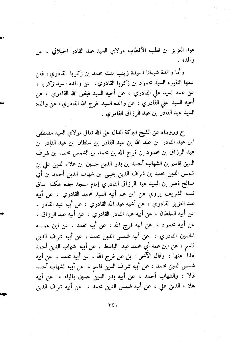 ح ورويناه عن الشيخ البركة الدال على الله تعالى مولاي السيد مصطفى بن عبد القادر بن عبد الله بن عبد القادر بن سلطان بن عبد القادر بن عبد الرزاق بن محمود بن فرج الله بن محمد بن الشمس محمد بن شرف الدين قاسم بن الشهاب أحمد بن بدر الدين حسين بن علاء الدين علي بن شمس الدين محمد بن شرف الدين يحيى بن شهاب الدين أحمد بن أبي صالح نصر بن السيد عبد الرزاق القادري إمام مسجد جده هكذا ساق نسبه الشريف يروي عن ابن عم أبيه السيد محمد القادري، عن أبيه عبد العزيز القادري، عن أخيه عبد الله القادري، عن أبيه عبد القادر، عن أبيه السلطان، عن أبيه عبد القادر القادري، عن أبيه عبد الرزاق، عن أبيه محمود، عن أبيه فرج الله، عن أبيه محمد، عن ابن عمه الحسين القادري، عن أبيه شمس الدين محمد، عن أبيه شرف الدين قاسم، عن ابن عمه أبي محمد عبد الباسط، عن أبيه شهاب الدين أحمد هذا عنها، وقال الآخر: بل عن فرج الله، عن أبيه محمد، عن أبيه شمس الدين محمد، عن أبيه شرف الدين قاسم، عن أبيه الشهاب أحمد قالا: والشهاب أحمد، عن أبيه بدر الدين حسين بالياء، عن أبيه علاء الدين علي، عن أبيه شمس الدين محمد، عن أبيه شرف الدين