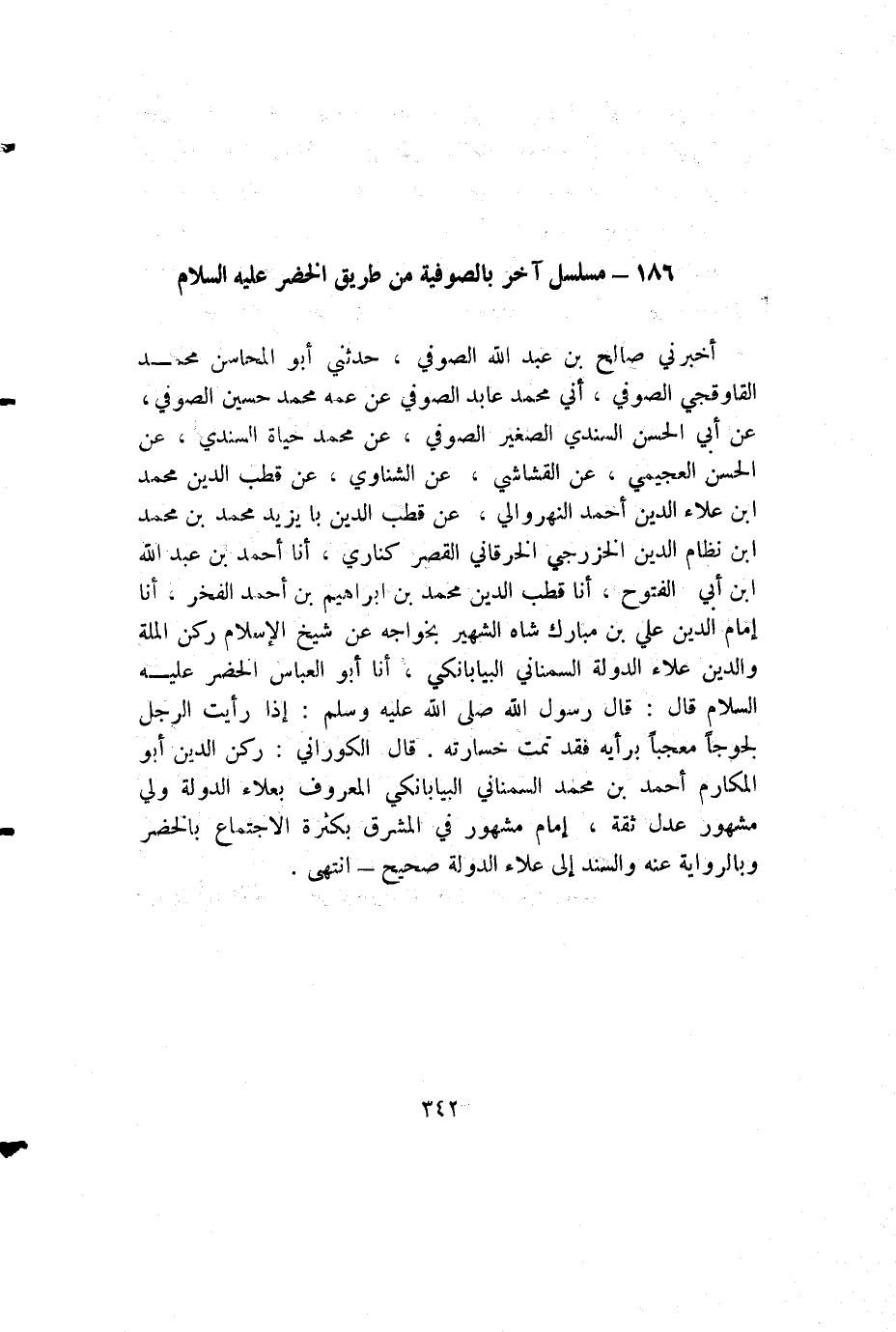 أخبرني صالح بن عبد الله الصوفي، حدثني أبو المحاسن محمد القاوقجي الصوفي، أني محمد عابد الصوفي عن عمه محمد حسين الصوفي، عن أبي الحسن السندي الصغير الصوفي، عن محمد حياة السندي، عن الحسن العجيمي، عن القشاشي، عن الشناوي، عن قطب الدين محمد بن علاء الدين أحمد النهروالي، عن قطب الدين با يزيد محمد بن محمد بن نظام الدين الخزرجي الخرقاني القصر كناري، أنا أحمد بن عبد الله ابن أبي الفتوح، أنا قطب الدين محمد بن إبراهيم بن أحمد الفخر، أنا إمام الدين علي بن مبارك شاه الشهير بخواجه عن شيخ الإسلام ركن الملة والدين علاء الدولة السمناني البيابانكي، أنا أبو العباس الخضر عليه السلام قال: قال رسول الله صلى الله عليه وسلم: إذا رأيت الرجل لجوجا معجبا برأيه فقد تمت خسارته. قال الكوراني: ركن الدين أبو المكارم أحمد بن محمد السمناني البيابانكي المعروف بعلاء الدولة ولي مشهور عدل ثقة، إمام مشهور في المشرق بكثرة الاجتماع بالخضر وبالرواية عنه والسند إلى علاء الدولة صحيح - انتهى.