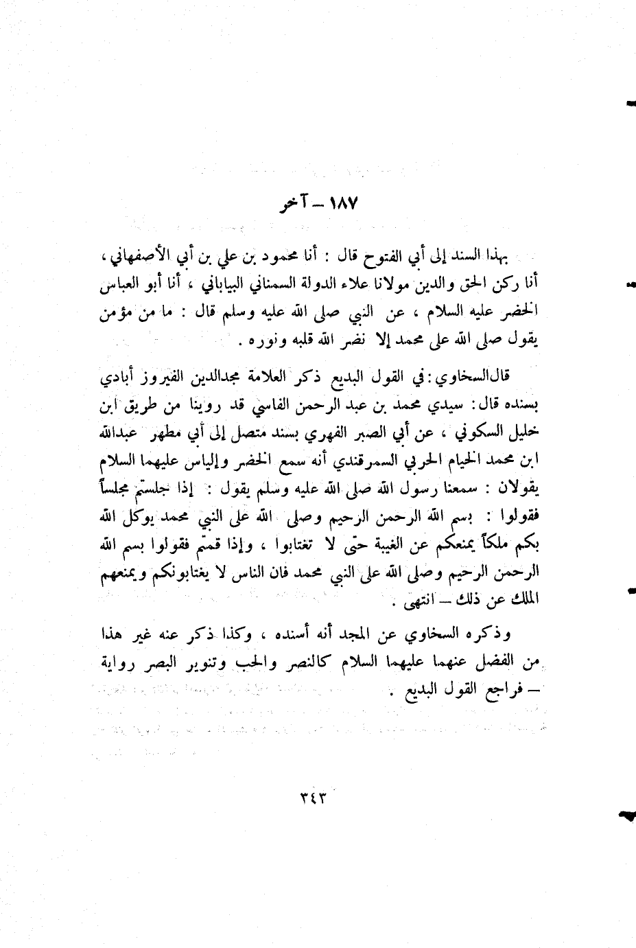 قال السخاوي: في القول البديع ذكر العلامة مجد الدين الفيروز أبادي بسنده قال: سيدي محمد بن عبد الرحمن الفاسي قد روينا من طريق ابن خليل السكوني، عن أبي الصبر الفهري بسند متصل إلى أبي مطهر عبد الله بن محمد الخيام الحربي السمرقندي أنه سمع الخضر وإلياس عليهما السلام يقولان: سمعنا رسول الله صلى الله عليه وسلم يقول: إذا جلستم مجلسا فقولوا: بسم الله الرحمن الرحيم وصلى الله على النبي محمد يوكل الله بكم ملكا يمنعكم عن الغيبة حتى لا تغتابوا، وإذا قمتم فقولوا بسم الله الرحمن الرحيم وصلى الله على النبي محمد فإن الناس لا يغتابونكم ويمنعهم الملك عن ذلك - انتهى.