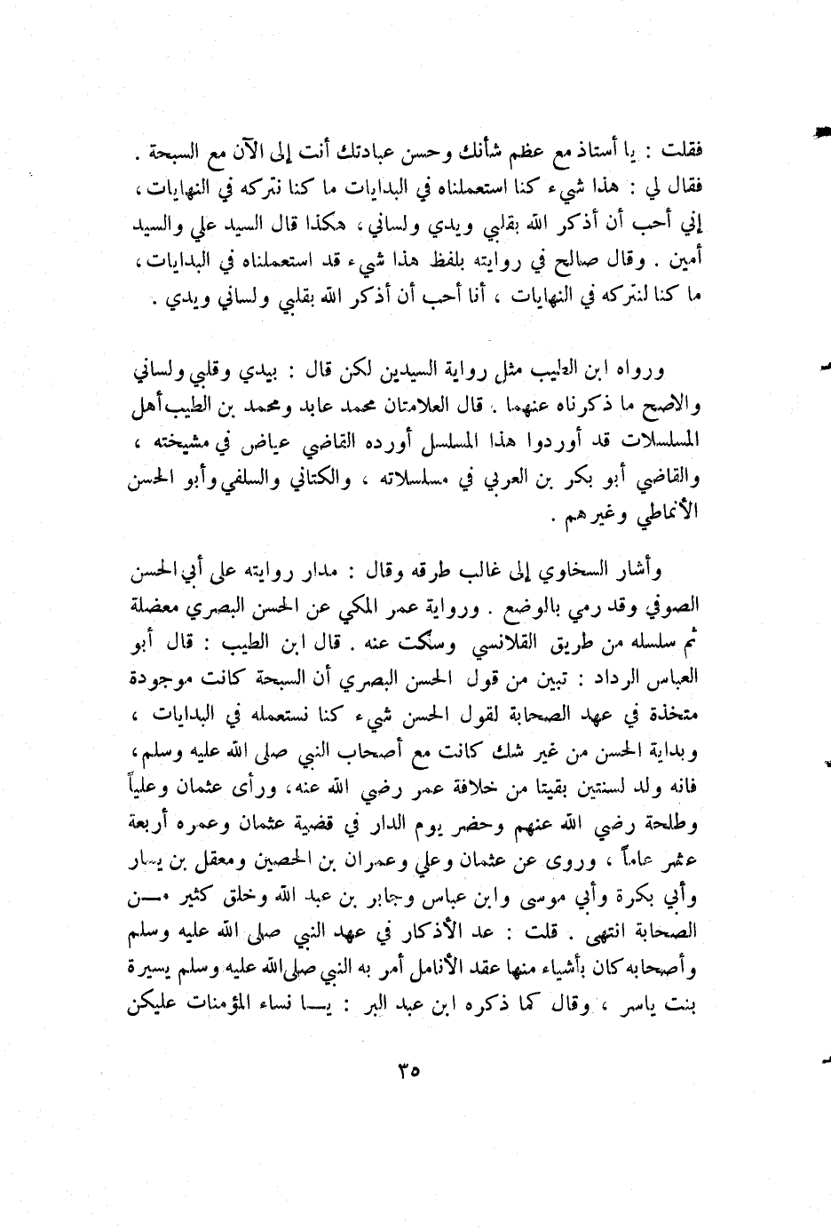وأشار السخاوي إلى غالب طرقه وقال: مدار روايته على أبي الحسن الصوفي وقد رمي بالوضع. ورواية عمر المكي عن الحسن البصري معضلة ثم سلسله من طريق القلانسي وسكت عنه. قال ابن الطيب: قال أبو العباس الرداد: تبين من قول الحسن البصري أن السبحة كانت موجودة متخذة في عهد الصحابة لقول الحسن شيء كنا نستعمله في البدايات، وبداية الحسن من غير شك كانت مع أصحاب النبي صلى الله عليه وسلم، فإنه ولد لسنتين بقيتا من خلافة عمر رضي الله عنه، ورأى عثمان وعليا وطلحة رضي الله عنهم وحضر يوم الدار في قضية عثمان وعمره أربعة عشر عاما، وروى عن عثمان وعلي وعمران بن الحصين ومعقل بن يسار وأبي بكرة وأبي موسى وابن عباس وجابر بن عبد الله وخلق كثير من الصحابة انتهى. قلت: عد الأذكار في عهد النبي صلى الله عليه وسلم وأصحابه كان بأشياء منها عقد الأنامل أمر به النبي صلى الله عليه وسلم يسيرة بنت ياسر، وقال كما ذكره ابن عبد البر: يا نساء المؤمنات عليكن
