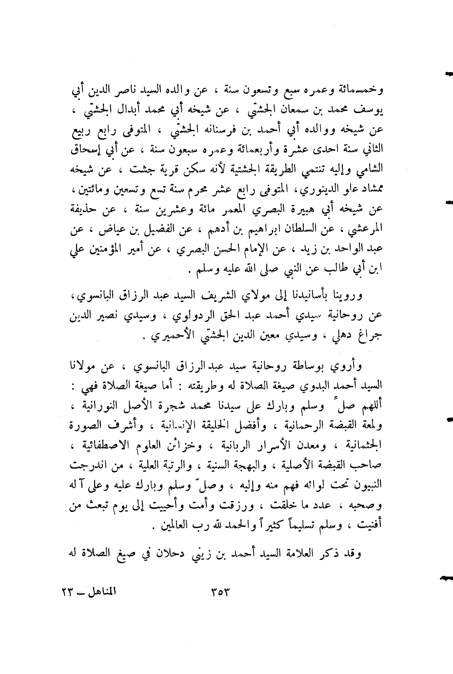 وروينا بأسانيدنا إلى مولاي الشريف السيد عبد الرزاق البانسوي، عن روحانية سيد أحمد عبد الحق الردولوي، وسيدي نصير الدين جراغ دهلي، وسيدي معين الدين الجشتي الأحميري.