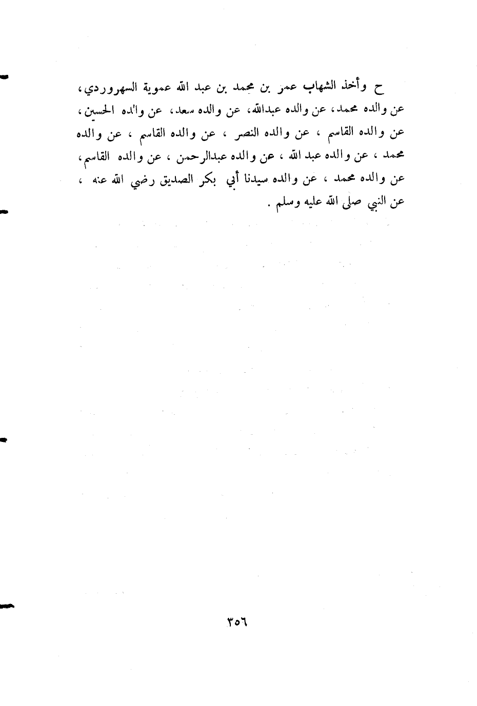ح وأخذ الشهاب عمر بن محمد بن عبد الله عموية السهروردي، عن والده محمد، عن والده عبد الله، عن والده سعد، عن والده الحسين، عن والده القاسم، عن والده النصر، عن والده القاسم، عن والده محمد، عن والده عبد الله، عن والده عبد الرحمن، عن والده القاسم، عن والده محمد، عن والده سيدنا أبي بكر الصديق رضي الله عنه، عن النبي صلى الله عليه وسلم.