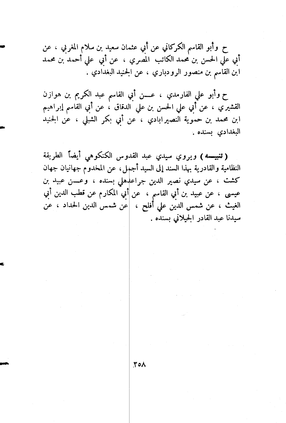 (تنبيه) ويروي سيدي عبد القدوس الكنكوهي أيضا الطريقة النظامية والقادرية بهذا السند إلى السيد أجمل، عن المخدوم جهانيان جهان كشت، عن سيدي نصير الدين جراعدهلي بسنده، وعن عبيد بن عيسى، عن عبيد بن أبي القاسم، عن أبي المكارم عن قطب الدين أبي الغيث، عن شمس الدين علي أفلح، عن شمس الدين الحداد، عن سيدنا عبد القادر الجيلاني بسنده.