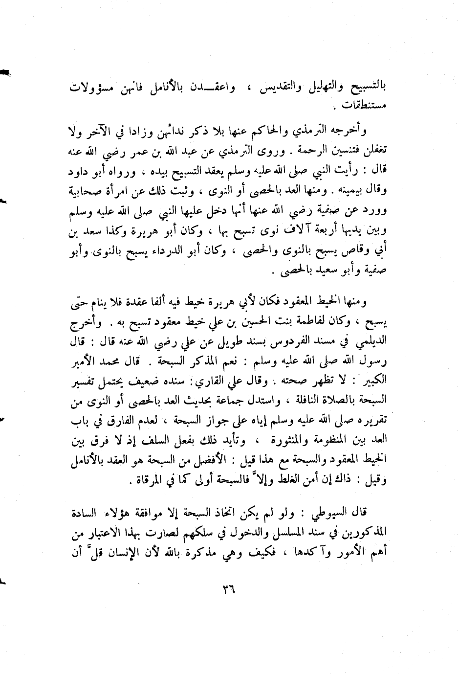 ومنها الخيط المعقود فكان لأبي هريرة خيط فيه ألفا عقدة فلا ينام حتى يسبح، وكان لفاطمة بنت الحسين بن علي خيط معقود تسبح به. وأخرج الديلمي في مسند الفردوس بسند طويل عن علي رضي الله عنه قال: قال رسول الله صلى الله عليه وسلم: نعم المذكر السبحة. قال محمد الأمير الكبير: لا تظهر صحته. وقال علي القاري: سنده ضعيف يحتمل تفسير السبحة بالصلاة النافلة، واستدل جماعة بحديث العد بالحصى أو النوى من تقريره صلى الله عليه وسلم إياه على جواز السبحة، لعدم الفارق في باب العد بين المنظومة والمنثورة، وتأيد ذلك بفعل السلف إذ لا فرق بين الخيط المعقود والسبحة مع هذا قيل: الأفضل من السبحة هو العقد بالأنامل وقيل: ذاك إن أمن الغلط وإلا فالسبحة أولى كما في المرقاة.