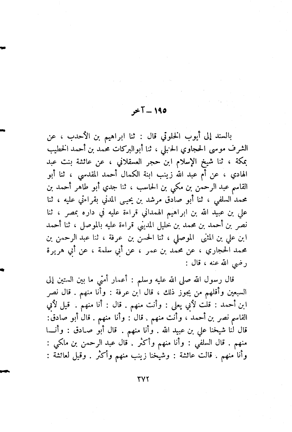 بالسند إلى أيوب الخلوتي قال: ثنا إبراهيم بن الأحدب، عن الشرف موسى الحجاوي الحنبلي، ثنا أبو البركات محمد بن أحمد الخطيب بمكة، ثنا شيخ الإسلام ابن حجر العسقلاني، عن عائشة بنت عبد الهادي، عن أم عبد الله زينب ابنة الكمال أحمد المقدسي، ثنا أبو القاسم عبد الرحمن بن مكي بن الحاسب، ثنا جدي أبو طاهر أحمد بن محمد السلفي، ثنا أبو صادق مرشد بن يحيى المدني بقراءتي عليه، ثنا علي بن عبيد الله بن إبراهيم الهمداني قراءة عليه في داره بمصر، ثنا نصر بن أحمد بن محمد بن خليل المديني قراءة عليه بالموصل، ثنا أحمد بن علي بن المثنى الموصلي، ثنا الحسن بن عرفة، ثنا عبد الرحمن بن محمد الحجاري، عن محمد بن عمر، عن أبي سلمة، عن أبي هريرة رضي الله عنه، قال:
