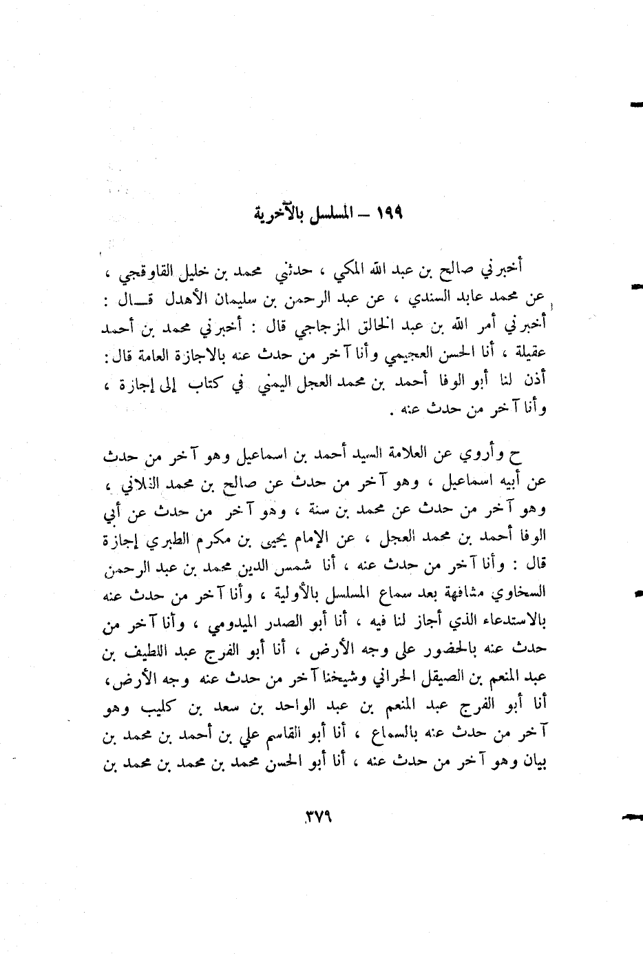 ح وأروي عن العلامة السيد أحمد بن إسماعيل وهو آخر من حدث عن أبيه إسماعيل، وهو آخر من حدث عن صالح بن محمد الفلاني، وهو آخر من حدث عن محمد بن سنة، وهو آخر من حدث عن أبي الوفا أحمد بن محمد العجل، عن الإمام يحيى بن مكرم الطبري إجازة قال: وأنا آخر من حدث عنه، أنا شمس الدين محمد بن عبد الرحمن السخاوي مشافهة بعد سماع المسلسل بالأولية، وأنا آخر من حدث عنه بالاستدعاء الذي أجاز لنا فيه، أنا أبو الصدر الميدومي، وأنا آخر من حدث عنه بالحضور على وجه الأرض، أنا أبو الفرج عبد اللطيف بن عبد المنعم بن الصيقل الحراني وشيخنا آخر من حدث عنه وجه الأرض، أنا أبو الفرج عبد المنعم بن عبد الواحد بن سعد بن كليب وهو آخر من حدث عنه بالسماع، أنا أبو القاسم علي بن أحمد بن محمد بن بيان وهو آخر من حدث عنه، أنا أبو الحسن محمد بن محمد بن محمد بن