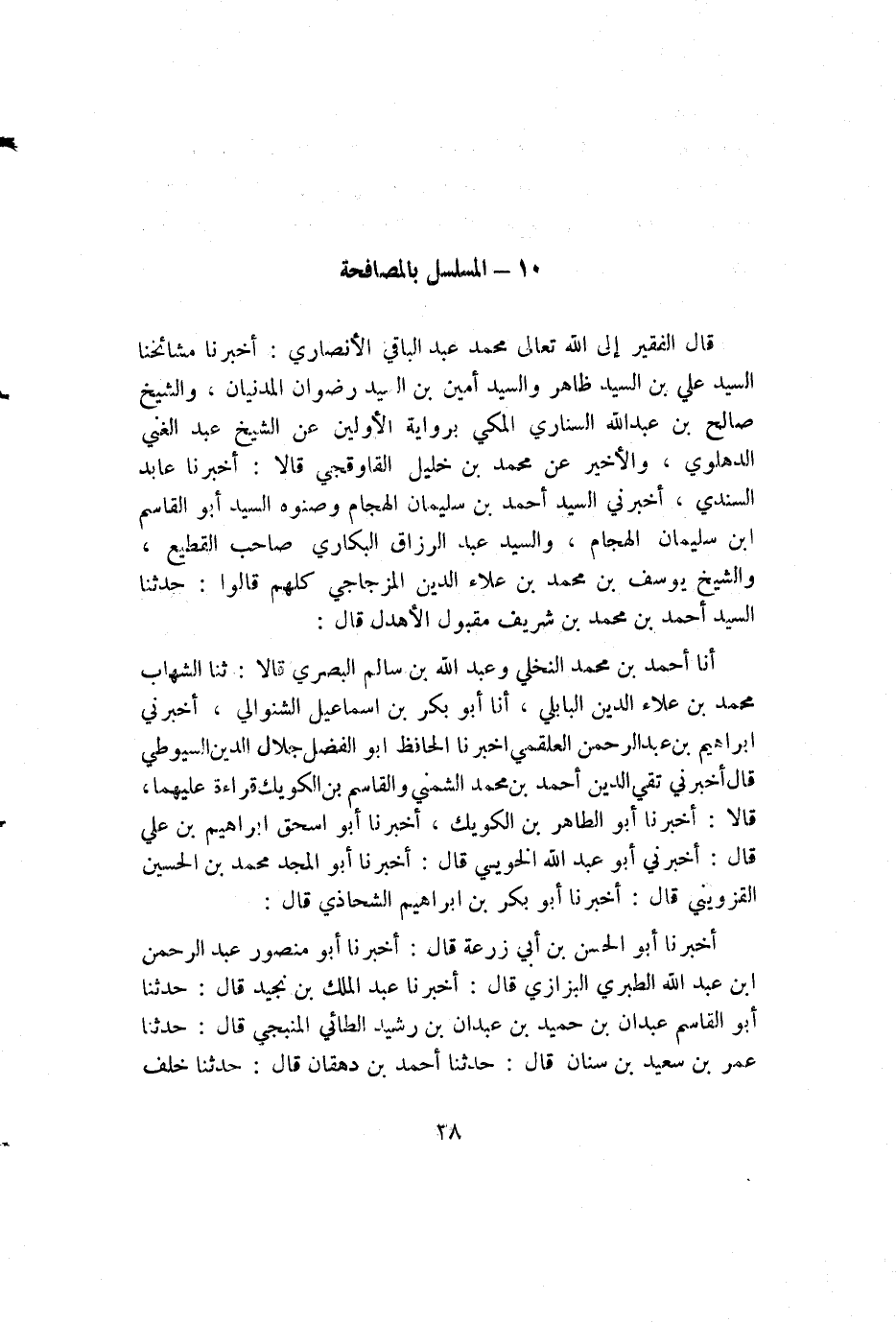 قال الفقير إلى الله تعالى محمد عبد الباقي الأنصاري: أخبرنا مشائخنا السيد علي بن السيد ظاهر والسيد أمين بن السيد رضوان المدنيان، والشيخ صالح بن عبد الله السناري المكي برواية الأولين عن الشيخ عبد الغني الدهلوي، والأخير عن محمد بن خليل القاوقجي قالا: أخبرنا عابد السندي، أخبرني السيد أحمد بن سليمان الهجام وصنوه السيد أبو القاسم بن سليمان الهجام، والسيد عبد الرزاق البكاري صاحب القطيع، والشيخ يوسف بن محمد بن علاء الدين المزجاجي كلهم قالوا: حدثنا السيد أحمد بن محمد بن شريف مقبول الأهدل قال:
