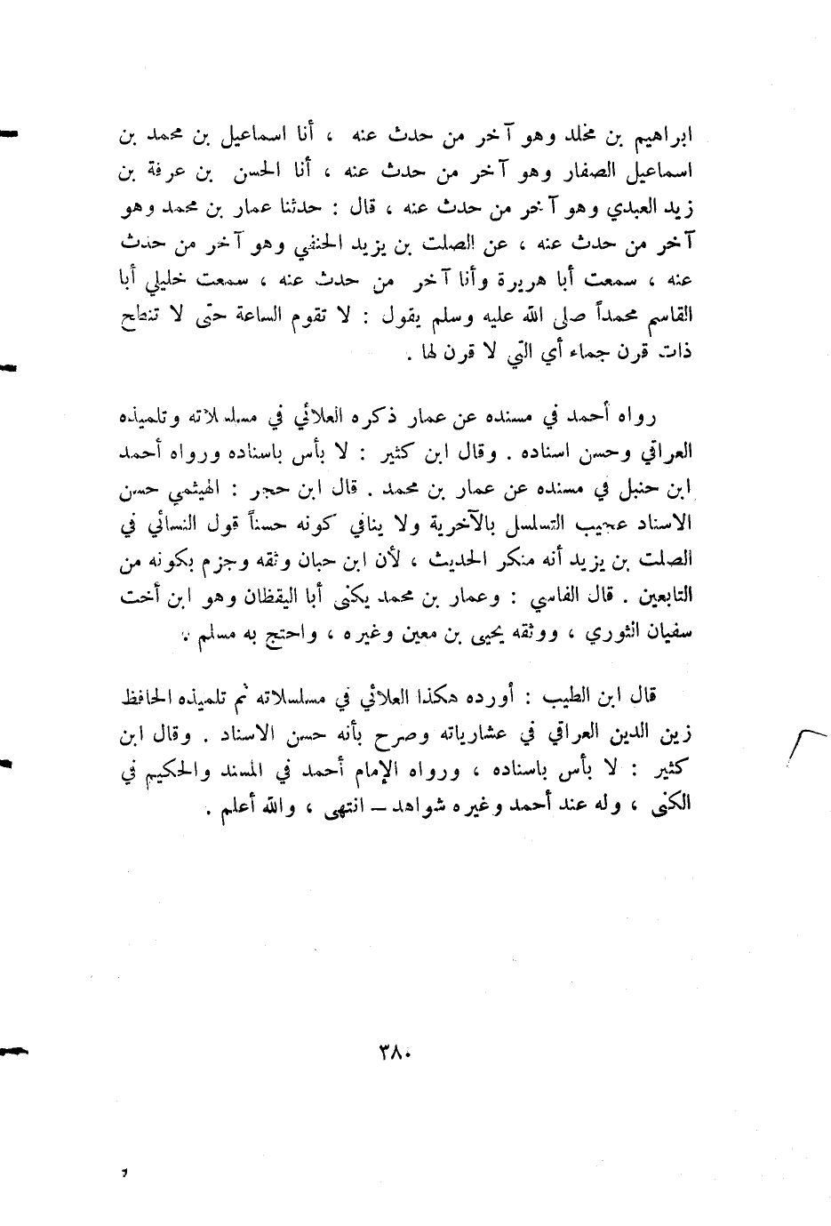 إبراهيم بن مخلد وهو آخر من حدث عنه، أنا إسماعيل بن محمد بن إسماعيل الصفار وهو آخر من حدث عنه، أنا الحسن بن عرفة بن زيد العبدي وهو آخر من حدث عنه، قال: حدثنا عمار بن محمد وهو آخر من حدث عنه، عن الصلت بن يزيد الحنفي وهو آخر من حدث عنه، سمعت أبا هريرة وأنا آخر من حدث عنه، سمعت خليلي أبا القاسم محمدا صلى الله عليه وسلم يقول: لا تقوم الساعة حتى لا تنطح ذات قرن جماء أي التي لا قرن لها.