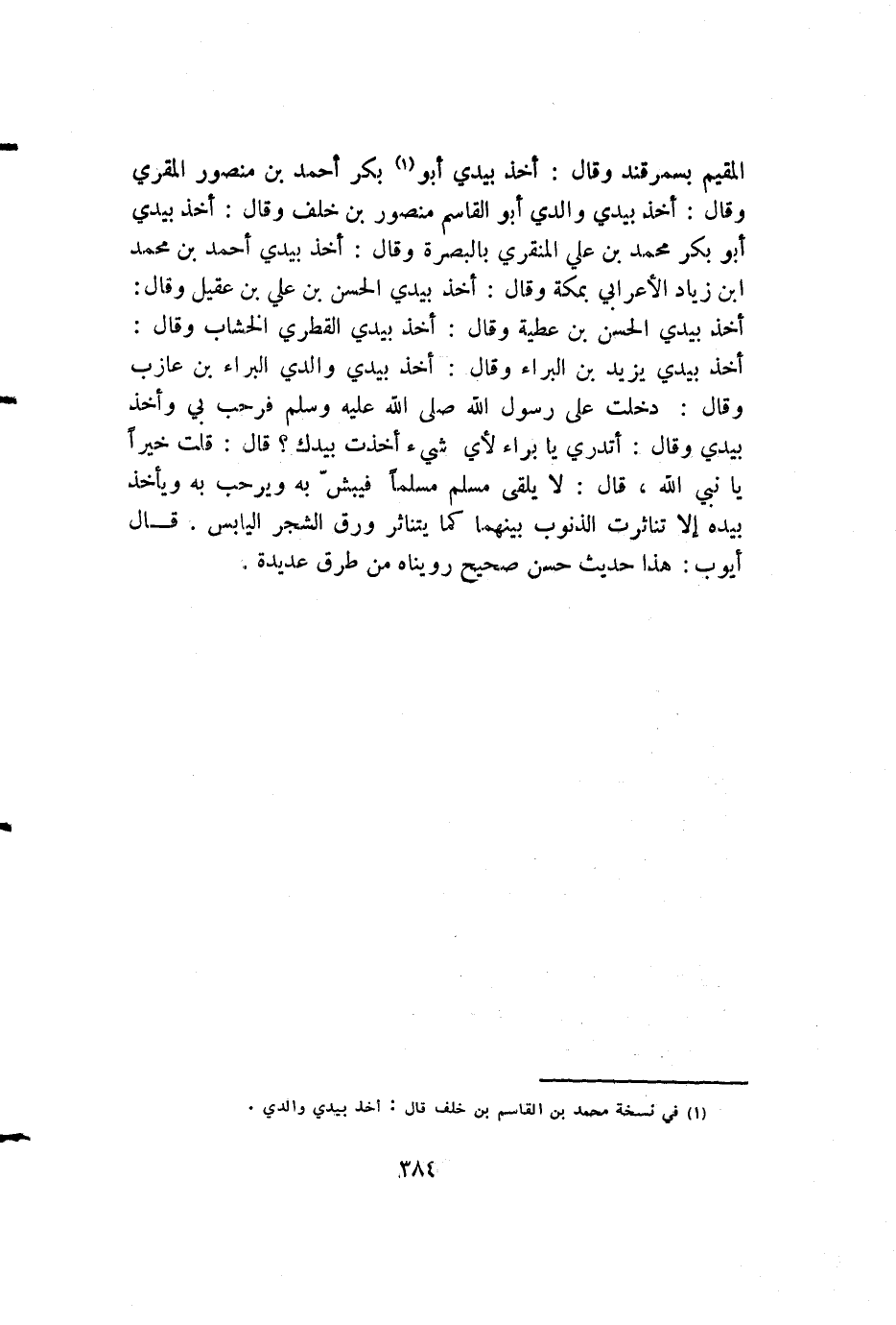 المقيم بسمرقند وقال: أخذ بيدي أبو بكر أحمد بن منصور المقري وقال: أخذ بيدي والدي أبو القاسم منصور بن خلف وقال: أخذ بيدي أبو بكر محمد بن علي المنقري بالبصرة وقال: أخذ بيدي أحمد بن محمد بن زياد الأعرابي بمكة وقال: أخذ بيدي الحسن بن علي بن عقيل وقال: أخذ بيدي الحسن بن عطية وقال: أخذ بيدي القطرب الخشاب وقال: أخذ بيدي يزيد بن البراء وقال: أخذ بيدي والدي البراء بن عازب وقال: دخلت على رسول اله صلى الله عليه وسلم فرحب بي وأخذ بيدي وقال: أتدري يا براء لأي شيء أخذت بيدك؟ قال: قلت خيرا يا نبي الله، قال: لا يلقى مسلم مسلماً فيبشّ به ويرحب به ويأخذ بيده إلا تناثرت الذنوب بينهما كما يتناثر ورق الشجر اليابس. قال أيوب: هذا حديث حسن صحيح رويناه من طرق عديدة.