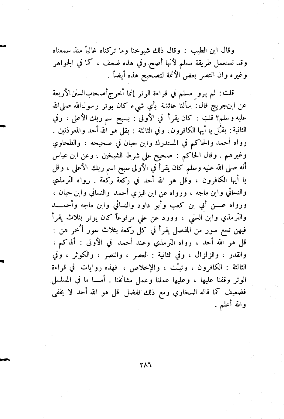 قلت: لم يرو مسلم في قراءة الوتر إنما أخرج أصحاب السنن الأربعة عن ابن جريج قال: سألنا عائشة بأي شيء كان يوتر رسول الله صلى الله عليه وسلم؟ قلت: كان يقرأ في الأولى: بسبح اسم ربك الأعلى، وفي الثانية: بقل يا أيها الكافرون، وفي الثالثة: بقل هو الله أحد والمعوذتين. رواه أحمد والحاكم في المستدرك وابن حبان في صحيحه، والطحاوي وغيرهم. وقال الحاكم: صحيح على شرط الشيخين. وعن ابن عباس أنه صلى الله عليه وسلم كان يقرأ في الأولى سبح اسم ربك الأعلى، وقل يا أيها الكافرون، وقل هو الله أحد في ركعة ركعة. رواه الترمذي والنسائي وابن ماجه، ورواه عن ابن البزي أحمد والنسائي وابن حبان، ورواه عن أبي بن كعب وأبو داود والنسائي وابن ماجه وأحمد والترمذي وابن السني، وورد عن علي مرفوعا كان يوتر بثلاث يقرأ فيهن تسع سور من المفصل يقرأ في كل ركعة بثلاث سور أخر هن: قل هو الله أحد، رواه الترمذي وعند أحمد في الأولى: ألهاكم، والقدر، والزلزال، وفي الثانية: العصر، والنصر، والكوثر، وفي الثالثة: الكافرون، وتبت، والإخلاص، فهذه روايات في قراءة الوتر وقفنا عليها، وعليها عملنا وعمل مشائخنا. أما ما في المسلسل فضعيف كما قاله السخاوي ومع ذلك ففضل قل هو الله أحد لا يخفى والله أعلم.
