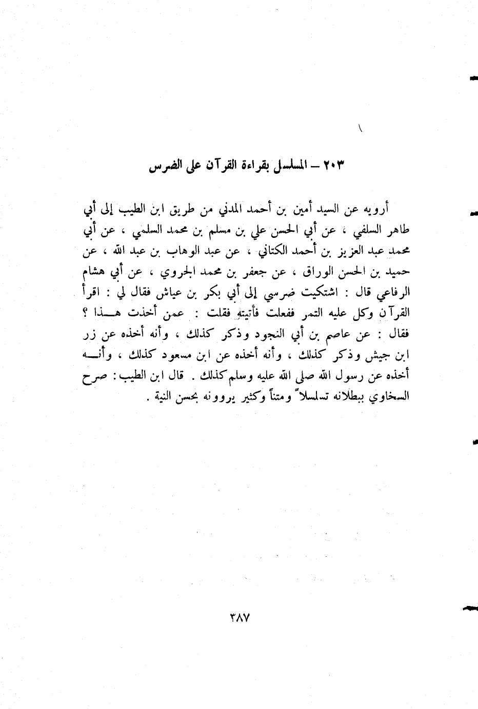 أرويه عن السيد أمين بن أحمد المدني من طريق ابن الطيب إلى أبي طاهر السلفي، عن أبي الحسن علي بن مسلم بن محمد السلمي، عن أبي محمد عبد العزيز بن أحمد الكتاني، عن عبد الوهاب بن عبد الله، عن حميد بن الحسن الوراق، عن جعفر بن محمد الجروي، عن أبي هشام الرفاعي قال: اشتكيت ضرسي إلى أبي بكر بن عياش فقال لي: اقرأ القرآن وكل عليه التمر ففعلت فأتيته فقلت: عمن أخذت هذا؟ فقال: عن عاصم بن أبي النجود وذكر كذلك، وأنه أخذه عن زر بن جيش وذكر كذلك، وأنه أخذه عن ابن مسعود كذلك، وأنه أخذه عن رسول الله صلى الله عليه وسلم كذلك. قال ابن الطيب: صرح السخاوي ببطلانه تسلسلاً ومتناً وكثير يروونه بحسن النية.