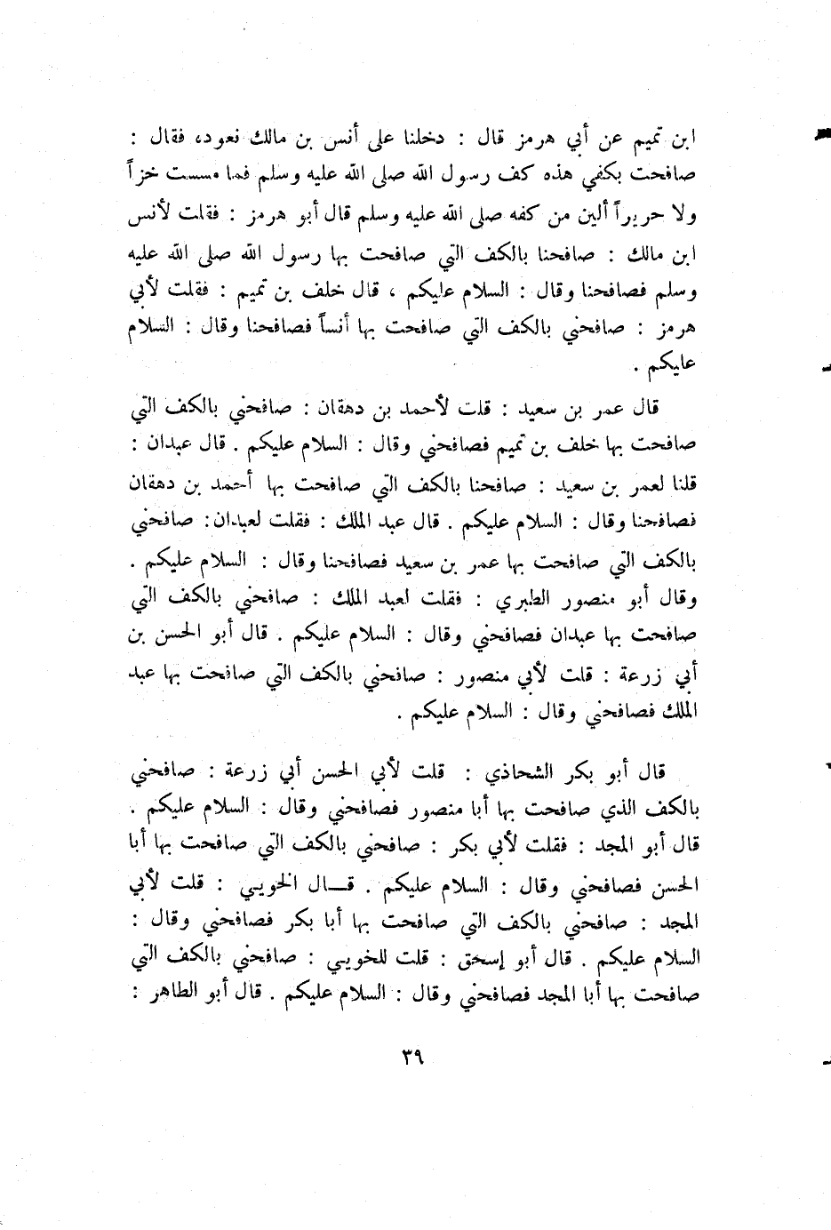 قال عمر بن سعيد: قلت لأحمد بن دهقان: صافحني بالكف التي صافحت بها خلف بن تميم فصافحني وقال: السلام عليكم. قال عبدان: قلنا لعمر بن سعيد: صافحنا بالكف التي صافحت بها أحمد بن دهقان فصافحنا وقال: السلام عليكم. قال عبد الملك: فقلت لعبدان: صافحني بالكف التي صافحت بها عمر بن سعيد فصافحنا وقال: السلام عليكم. وقال أبو منصور الطبري: فقلت لعبد الملك: صافحني بالكف التي صافحت بها عبدان فصافحني وقال: السلام عليكم. قال أبو الحسن بن أبي زرعة: قلت لأبي منصور: صافحني بالكف التي صافحت بها عبد الملك فصافحني وقال: السلام عليكم.