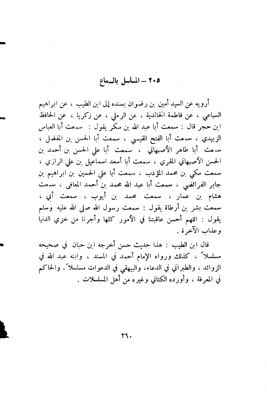 أرويه عن السيد أمين بن رضوان بسنده إلى ابن الطيب، عن إبراهيم السباعي، عن فاطمة الخالدية، عن الرملي، عن زكريا، عن الحافظ ابن حجر قال: سمعت أبا عبد الله بن سكر يقول: سمعت أبا العباس الزبيدي، سمعت أبا الفتح القيسي، سمعت أبا الحسن بن المفضل، سمعت أبا طاهر الأصبهاني، سمعت أبا علي الحسن بن أحمد بن الحسن الأصبهاني المقري، سمعت أبا أسعد إسماعيل بن علي الرازي، سمعت مكي بن محمد المؤدب، سمعت أبا علي الحسين بن إبراهيم بن جابر الفرائضي، سمعت أبا عبد الله محمد بن أحمد المعافى، سمعت هشام بن عمار، سمعت محمد بن أيوب، سمعت أبي، سمعت بشر بن أرطاة يقول: سمعت رسول الله صلى الله عليه وسلم يقول: اللهم أحسن عاقبتنا في الأمور كلها وأجرنا من خزي الدنيا وعذاب الآخرة.