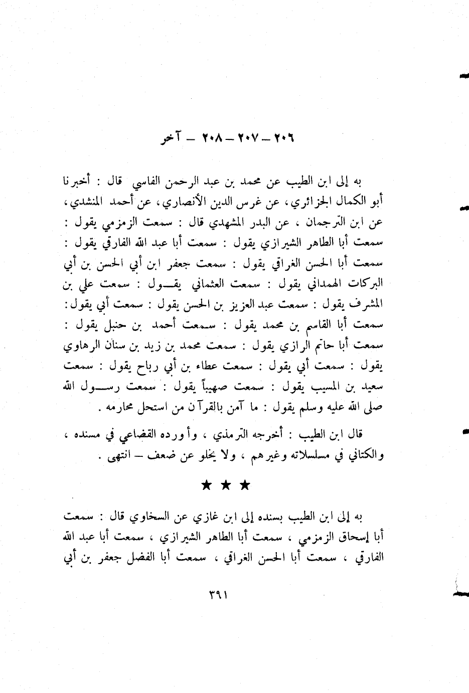 به إلى ابن الطيب عن محمد بن عبد الرحمن الفاسي قال: أخبرنا أبو الكمال الجزائري، عن غرس الدين الأنصاري، عن أحمد المنشدي، عن ابن الترجمان، عن البدر المشهدي قال: سمعت الزمزمي يقول: سمعت أبا الطاهر الشيرازي يقول: سمعت أبا عبد الله الفارقي يقول: سمعت أبا الحسن الغراقي يقول: سمعت جعفر ابن أبي الحسن بن أبي البركات الهمداني يقول: سمعت العثماني يقول: سمعت علي بن المشرف يقول: سمعت عبد العزيز بن الحسن يقول: سمعت أبي يقول: سمعت أبا القاسم بن محمد يقول: سمعت أحمد بن حنبل يقول: سمعت أبا حاتم الرازي يقول: سمعت محمد بن زيد بن سنان الرهاوي يقول: سمعت أبي يقول: سمعت عطاء بن أبي رباح يقول: سمعت سعيد بن المسيب يقول: سمعت صهيبا يقول: سمعت رسول الله صلى الله عليه وسلم يقول: ما آمن بالقرآن من استحل محارمه.