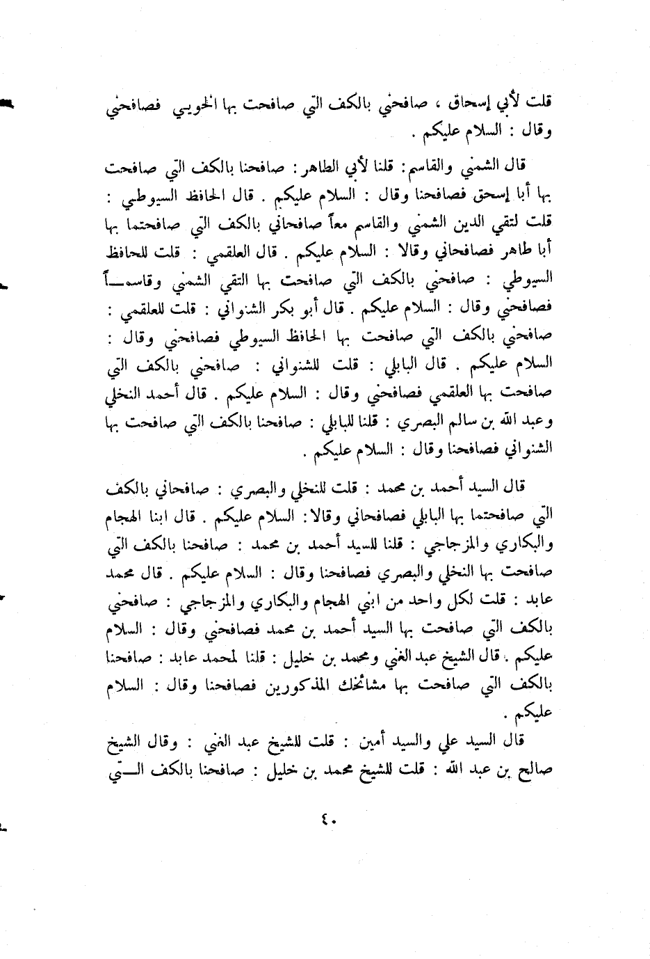 قال السيد علي والسيد أمين: قلت للشيخ عبد الغني: وقال الشيخ صالح بن عبد الله: قلت للشيخ محمد بن خليل: صافحنا بالكف التي