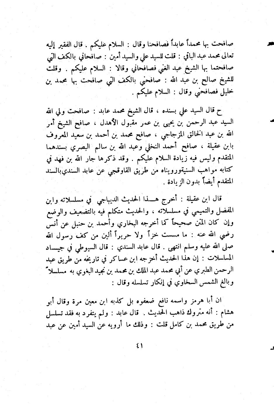 صافحت بها محمدا عابدا فصافحنا وقال: السلام عليكم. قال الفقير إليه تعالى محمد عبد الباقي: قلت للسيد علي والسيد أمين: صافحاني بالكف التي صافحتما بها الشيخ عبد الغني فصافحاني وقالا: السلام عليكم. وقلت للشيخ صالح بن عبد الله: صافحني بالكف التي صافحت بها محمد بن خليل فصافحني وقال: السلام عليكم.